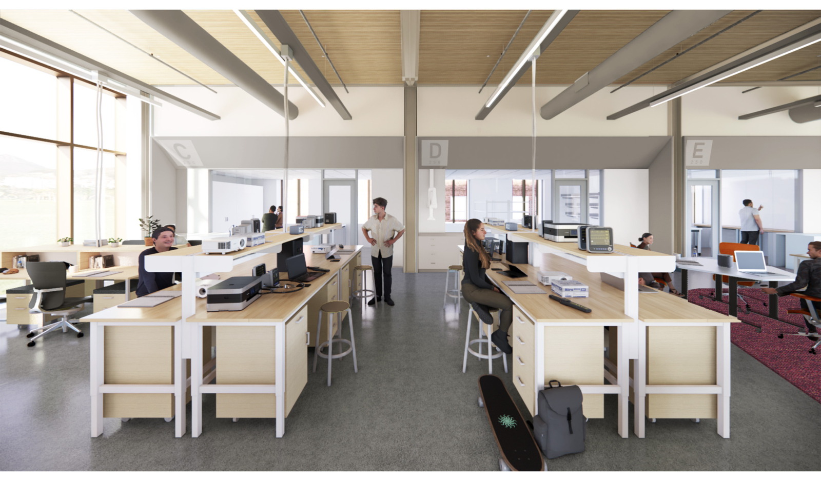 The research community of the SEL is loosely defined, intentionally. As research agendas and teams change, so too will the needs of the lab environment. In designing the lab, PAYETTE imagined a new type of research laboratory that could accommodate computational research, dry bench experimentation, and wet lab bench interchangeably. This ‘Lab Loft’ is made possible by a robust overhead infrastructure and dedicated zones for shared laboratory support space. The overhead infrastructure supports flexible power and data supply as well as the laboratory mechanical needs, all coordinated to accommodate multiple lab organization strategies while leaving the exposed DLT decking visible. The series of shared support spaces flanking the north and south of the lab can facilitate anything from intensive hood work, specialized equipment/research down to additional conference or breakout space.