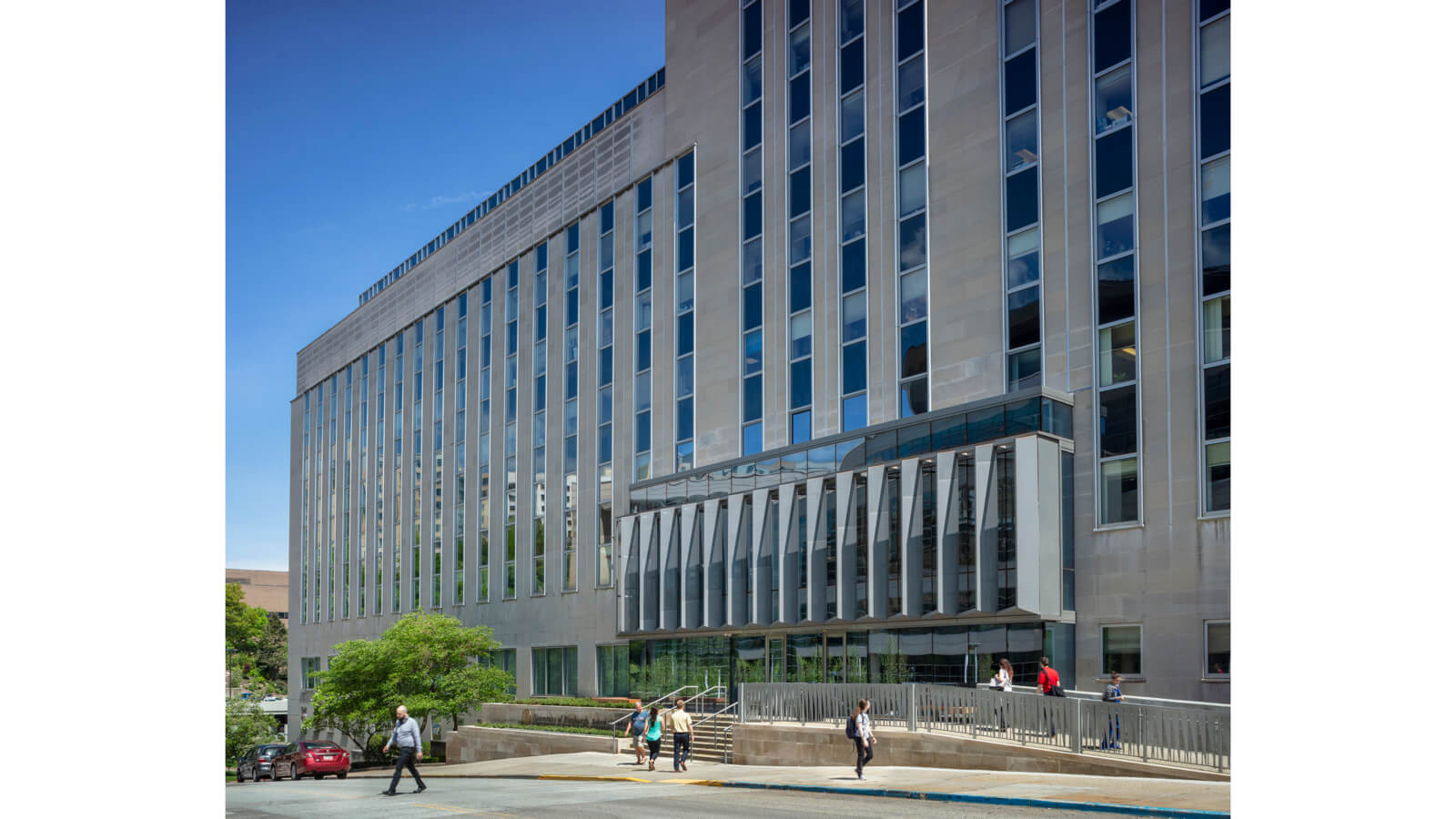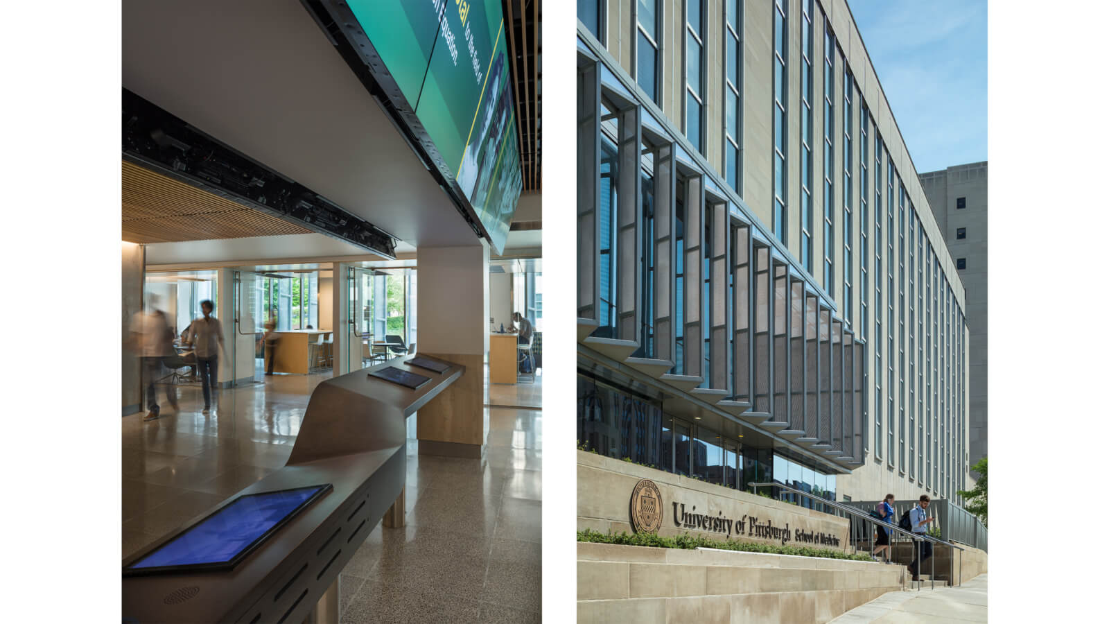 Inside, the transformation of the space began with removal of the original escalators, which rose through five floors of the building. An open stair had been an option in the original 1950s design. This grand gesture is now realized, encouraging walking to promote wellness and reducing energy and maintenance costs. At the top, a Tribute Wall highlights the careers of significant researchers from Pitt Medicine.