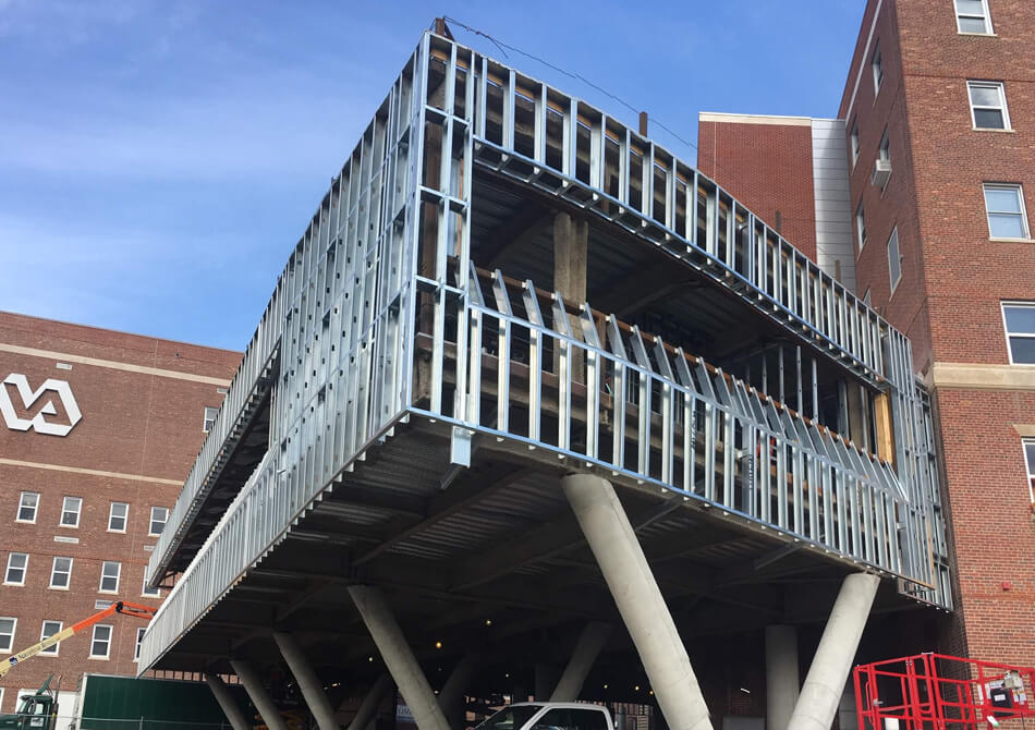 The Hemodialysis Pavilion ties directly into the main clinical floor of the hospital and wraps around an existing gingko tree, a central feature viewed from the waiting room. Patient and staff work areas are located along the perimeter with support spaces placed toward the interior of the plan. A vaulted ceiling array above frames the staff workspace, reinforces a sense of community providing a wonderful quality of light, and a place to work with optimum visibility. The exterior expression is no-nonsense and practical. Centria metal panels wrap the pavilion, while a continuous horizontal band of windows carved into its mass captures the horizon. It appears to float, supported on an array of V-shaped concrete encased steel columns; it acts as a canopy sheltering a staff entrance. The integration of the patient headwall with the exterior windowsill helps to frame views to the exterior and organize the visual clutter often associated with patient headwalls in hemodialysis treatment room settings. Our goal was to create an environment that was not focused on medical equipment, but simply the quality of light and community in a space that is tranquil and appears seemingly effortless in its execution.