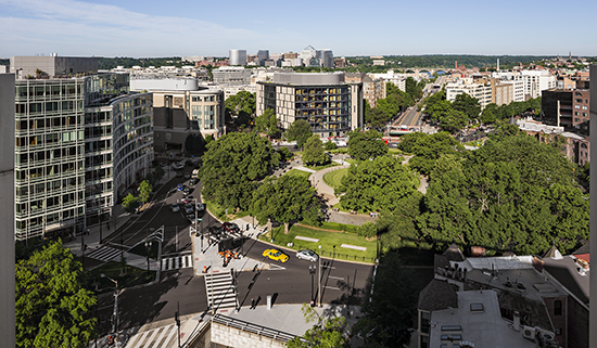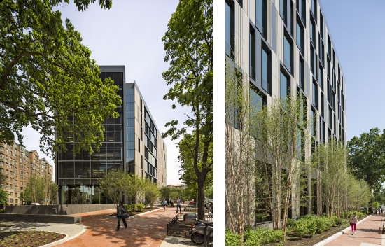 A new landscaped plaza along New Hampshire Avenue, across from the University’s medical center, frames the building’s main entrance. At the site’s southern tip, an existing neighborhood park has been expanded around a large oak tree. An aluminum sunscreen provides additional shading for the south-facing façade.
