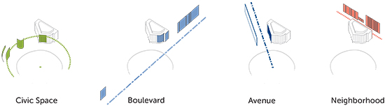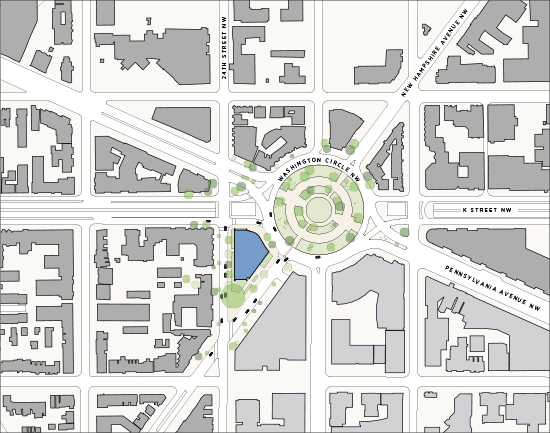 While today’s tour is sold out, the building’s highly visible location, just blocks from the White House, invites passersby to enjoy the building’s most visible design elements. The triangular site sits on Washington Circle, one of Washington DC’s iconic public spaces. The site is also bounded by New Hampshire Avenue and K Street, both grand boulevards in L’Enfant’s 1791 urban plan for the Capital, as well as 24th Street, which marks the site’s transition into the historic Foggy Bottom district. The site’s southern tip was preserved to expand and improve an existing neighborhood park.