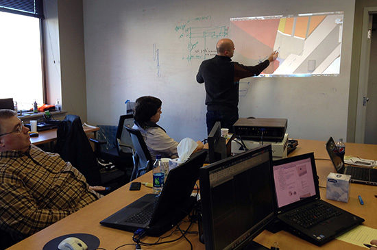 Neither the Krion nor the steel fabricators had heard of colocation before working with the Alexandria team. However, both remarked on how much they enjoyed the two week colocation experience and how the collaboration sped up the overall process. The Krion fabricator even commented on how elements of our design inspired ideas for future projects. All of us benefited from sharing our knowledge of different 3D programs and learned from each other while developing the spiral stair at colocation.