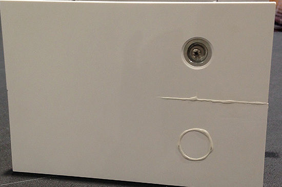 The stair underwent many design iterations before a final profile was reached. In its earliest stages, each flight of the stair had a unique radius and profile, most similar to the logo itself (image 1). As the stair developed, the radius became the same for each flight and the profile changed shape as it spiraled from the bottom floor to the top (image 2). In the end, the profile of the inner curve became rectangular and the outer curve maintained a continuous beveled profile (image 3). While the profile underwent many variations, the design intent was always for the stair material to be a continuous, solid surface. For that reason, Krion – a solid surface material manufactured by Porcelanosa – was chosen because sheets of the material can be thermoformed into curved pieces and then seamlessly welded together to create one continuous smooth surface.