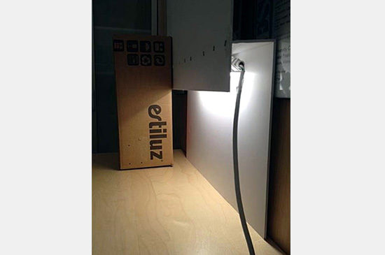 The geometry of the final profile incorporates a ½” reveal joint that aligns with each floor level in addition to a ½” reveal located at all openings of the adjacent plaster accent wall, from which the spiral stair projects. An inset vertical white Krion panel, offset a set dimension from the surface of the stair tread, accommodates a flexible LEDlight fixture within a light cove.