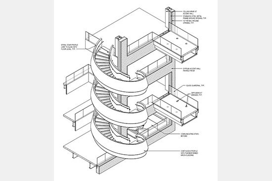 The monumental red spiral staircase that will connect 75 and 125 Binney Street within the building’s atrium was inspired by Ariad Pharmaceutical’s logo. The red, spiraling spool of thread in the logo, which represents pathways leading scientists to discoveries in medicine, encouraged PAYETTE’s Alexandria design team to create the similarly dynamic staircase, a custom feature which the team refined during colocation in Cambridge.