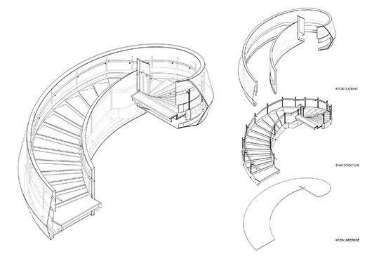 The next step in the spiral stair process will be off site production of final shop drawings and material fabrication, followed by installation on site. The steel structure for each of the three flights of stairs will be fabricated off site in two pieces, with the landing dividing the two. Each flight weighs approximately 11 tons, and will be lifted into place via crane. The landing and two halves will then be field welded on site. The Krion cladding will be thermoformed in 6’ panels, then assembled and welded together on site.