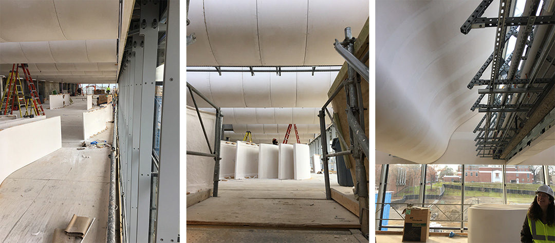 Framing is now in place below these to support acoustic absorption panels and a radiant heating/cooling system. Collecting warm air rising along the curtain wall, wave shaped radiant panels that form the base of the monitors (and roof of the commons) will generate a convective flow to condition the space and act as large scale chilled beams.