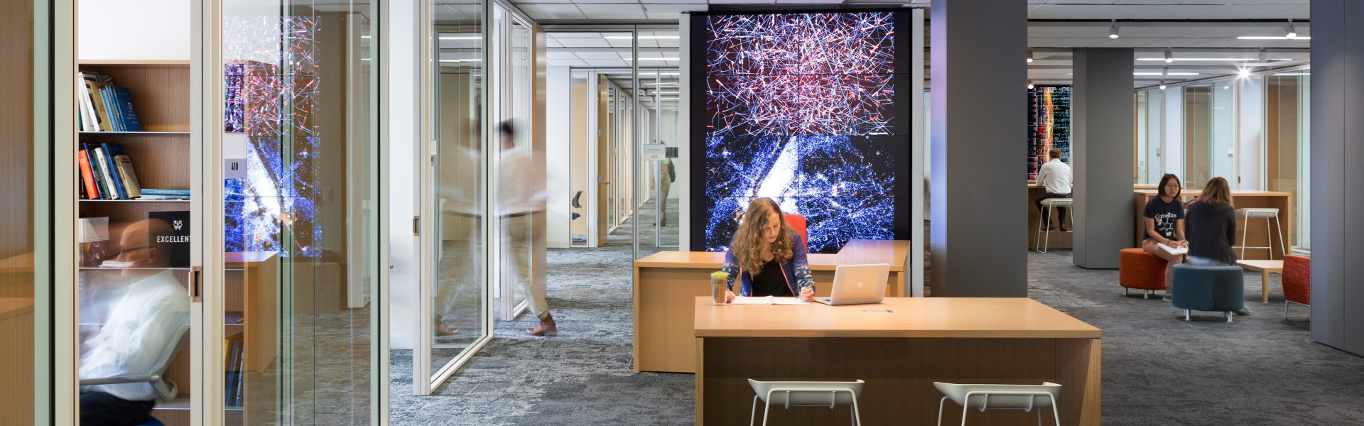 The architectural expression of the Institute is simple and clean, focusing on transparency and large open areas. Because the facilities in Mudd were originally configured as cellular and opaque, the School has struggled to share the important and exciting work that goes on behind closed doors. PAYETTE’s design works to set a course for the building that will change this and emphasize the importance of visual connection to work spaces and publically display the work. For the Institute, we included a series of signature media walls which will array monitors in prominent areas providing the researchers a medium with which to display and celebrate their work.