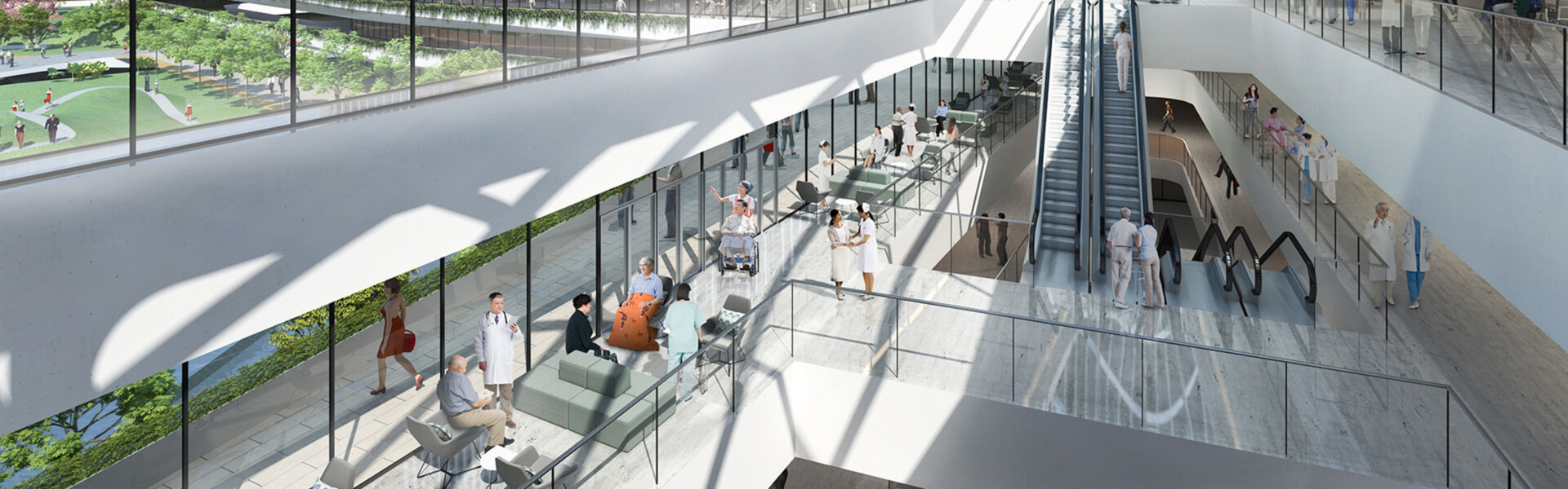 The team worked to develop a fully integrated hospital that would connect the hospital’s programs both horizontally and vertically with maximum efficiency. This resulting design creates a contiguity that will result in more rational and intuitive circulation, shorter travel distances and direct connectivity for all critical functions, helping to ensure proper care for patients and usability for staff across the medical campus.