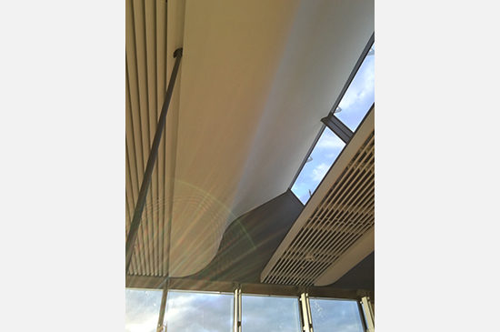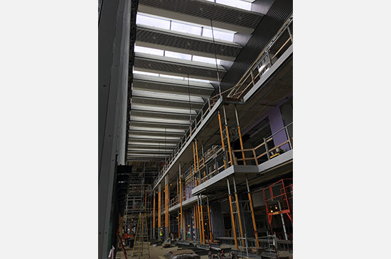 The latest construction achievement was the removal of the scaffolding from part of the Commons. Revealing for the first time both the scale and intimacy of this “living room” for the campus. The gray skies of winter do not dull the luminosity of this space. The soft sculptural forms of the light monitors float gently above, concealing their high-tech heating and cooling systems and revealing views of the sky.