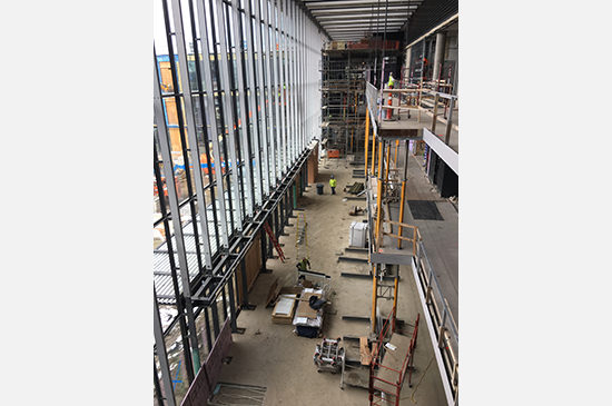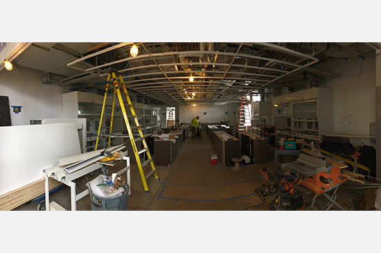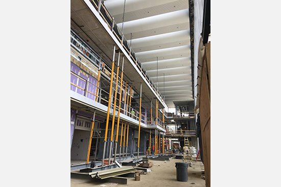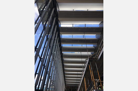Elsewhere in the building the progress and craftsmanship are now truly apparent. With almost 300 people on site every day, more and more areas near completion: from the Commons where connecting stairs and final finishes will soon be installed, to the casework and fume hoods in teaching and research labs. No design detail was too small for study – from restroom tiles to the pleats on the office draperies to the cable net railings in the fire stairs.