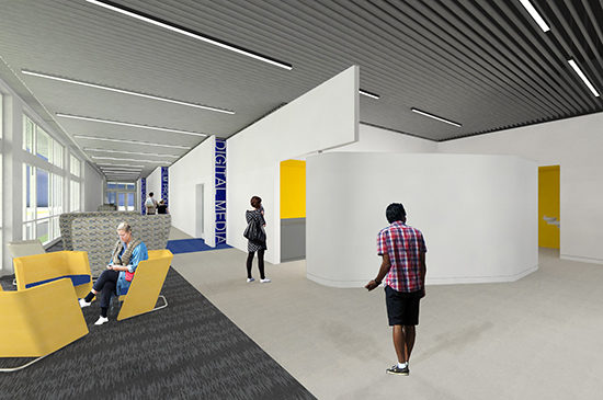The design adapts the existing pitched roof by extending and altering its form. The result will transform the previously planned entry tower into a double height Student Art Gallery. When completed, the gallery will become the beacon for the entrance off the street and is replicated with a more sculptural entrance at the north of the building, bookending the student commons space within.