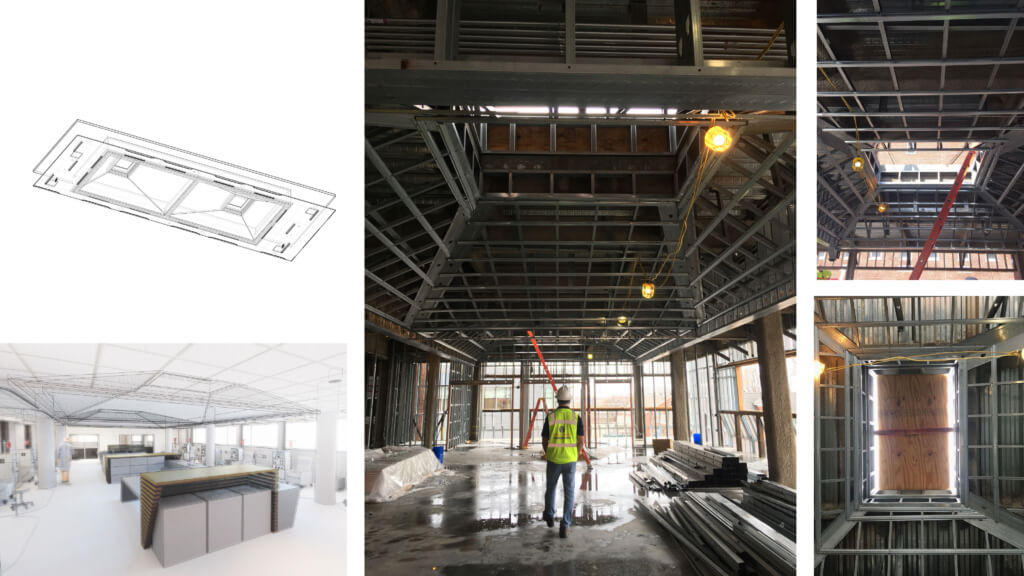 At only 11,670 BGSF, the planning of the hemodialysis treatment space was a practice in restraint and simplicity. The main treatment space of the clinic will feature eleven dialysis bays and private rooms, organized around a custom staff station and recently framed dual skylights, the forms of which echo the angled compositions on the exterior. These windows to the sky will diffuse the light above the staff station, creating a glowing central space, which is a far cry from the clinic’s existing basement location.
