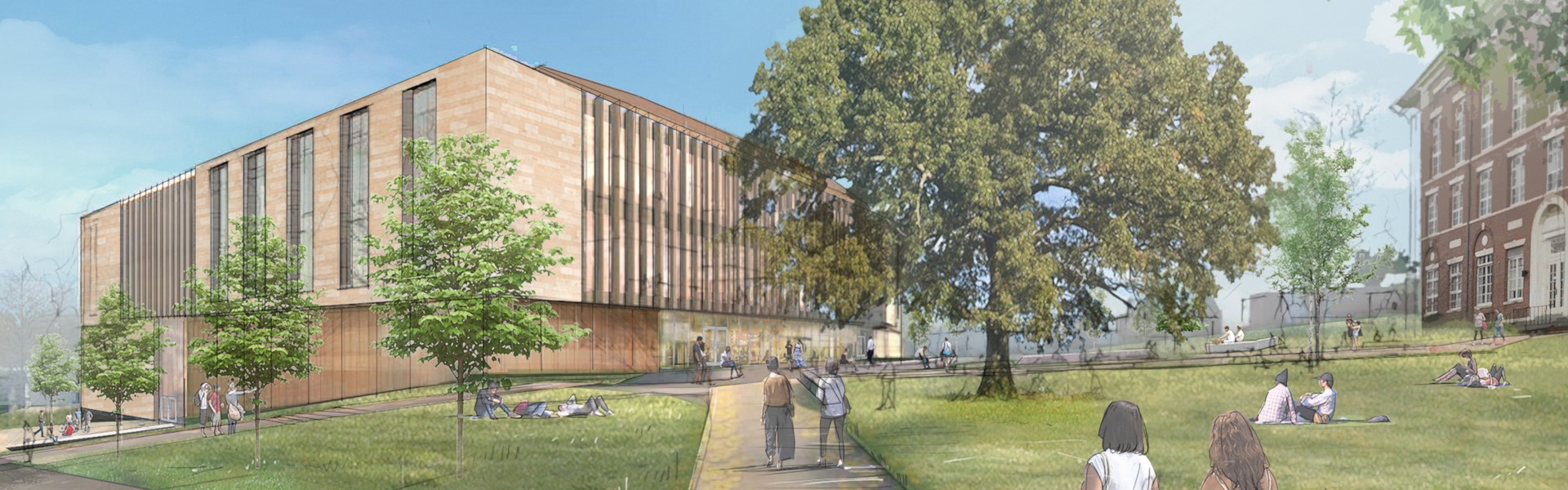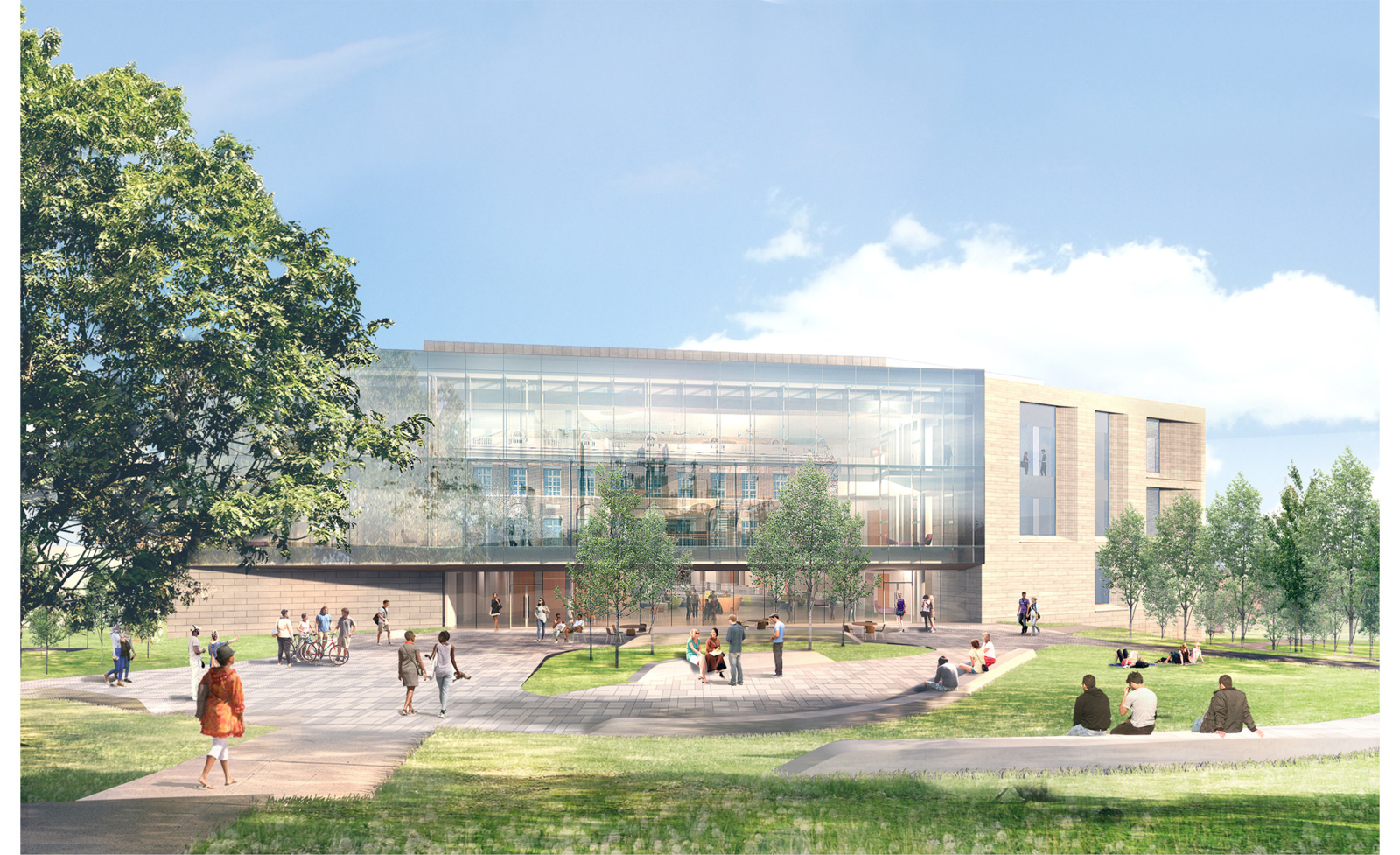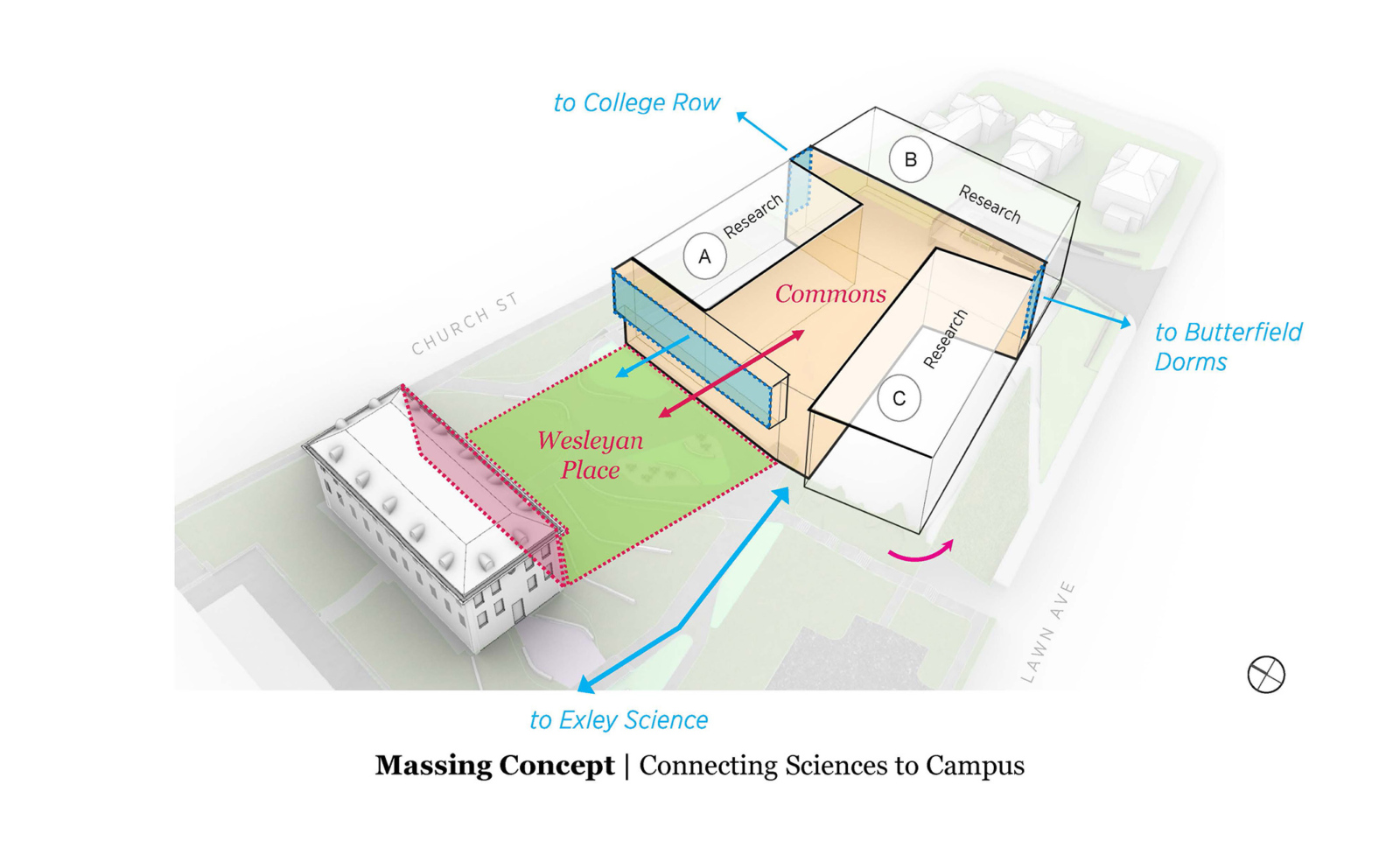 In crisp contrast to the built-up masonry façade, the highly-transparent, minimally-detailed ‘double-skin’ façade announces ‘Science on Display’ from the northwest campus approach. This broad face also fronts the renewed Wesleyan Place – a landscape courtyard centered between New Science and the renovated Shanklin Hall (McKimm Mead and White, 1928). While inviting observers into the building, this façade also pushes the interior atrium space that binds the three research clusters outward into the public outdoor realm. This west-facing glass volume engages in a direct relationship across the exterior space from to Hall, whose image will be clearly reflected in daytime conditions.