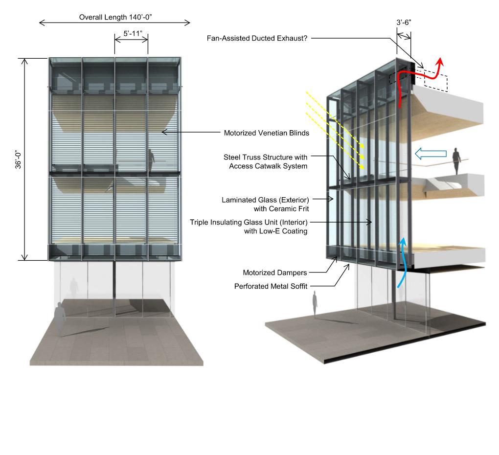 Additionally, the desire to reduce annual heating loads meant that any large, glazed façade had to perform substantially better thermally than a standard aluminum curtain wall system.