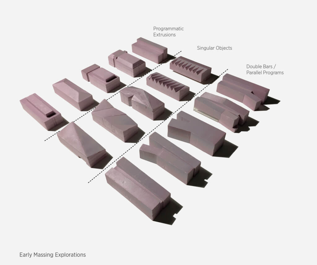 The first project leans more towards a traditional solid and singular mass that, through subtraction and form, reveals its contemporary ethos. The next focuses on the planar, attempting to be as thin as possible in a masonry medium not traditionally associated with thinness. The final project deploys strategies of materiality and oblique readings to blur overt distinctions between a binary façade system in favor of a series of fades from one system to the next.