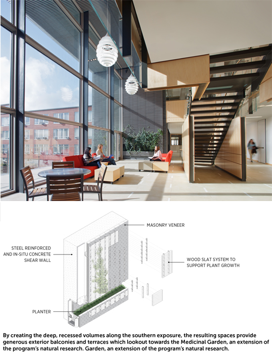 The balconies adjacent to the programs they support for the College of Pharmacy are contemplative locations. By creating deep, recessed volumes along the southern exposure, the resulting spaces provide generous exterior balconies and terraces which lookout towards the Medicinal Garden, an extension of the program’s natural research. The depth of the recess and location of the glass facade is optimized to maximize shading during the summer months. The construction of these neighborhoods revolve around two-story structural piers clad with a brick veneer and wood slats providing a surface for medicinal plantings to grow tall, thus creating a series of living “green walls” located at each neighborhood.