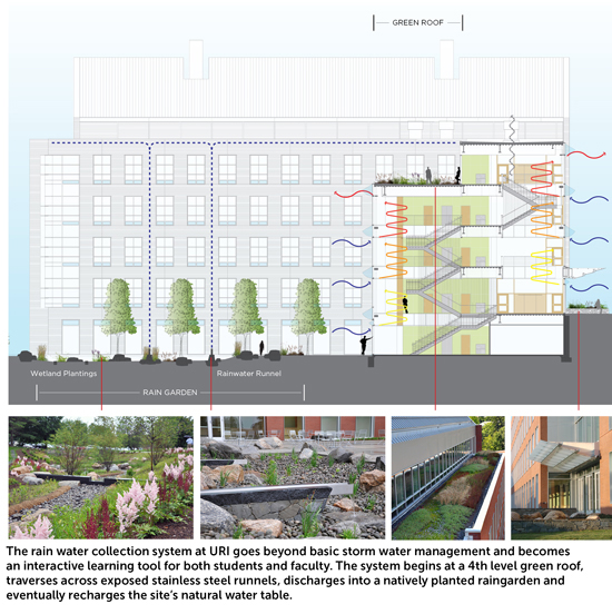The integration of the Rain Garden into the landscape provides a living example of natural processes for students to observe. The Rain Garden, adjacent to the Center for Biotechnology and Life Sciences, re-entrains groundwater from stormwater runoff at both grade and roof levels and is integrated with the building through the use of runnels. Using plant material indigenous to the area, the garden created a bio-habitat as well as a learning lab for the biology and life sciences programs.