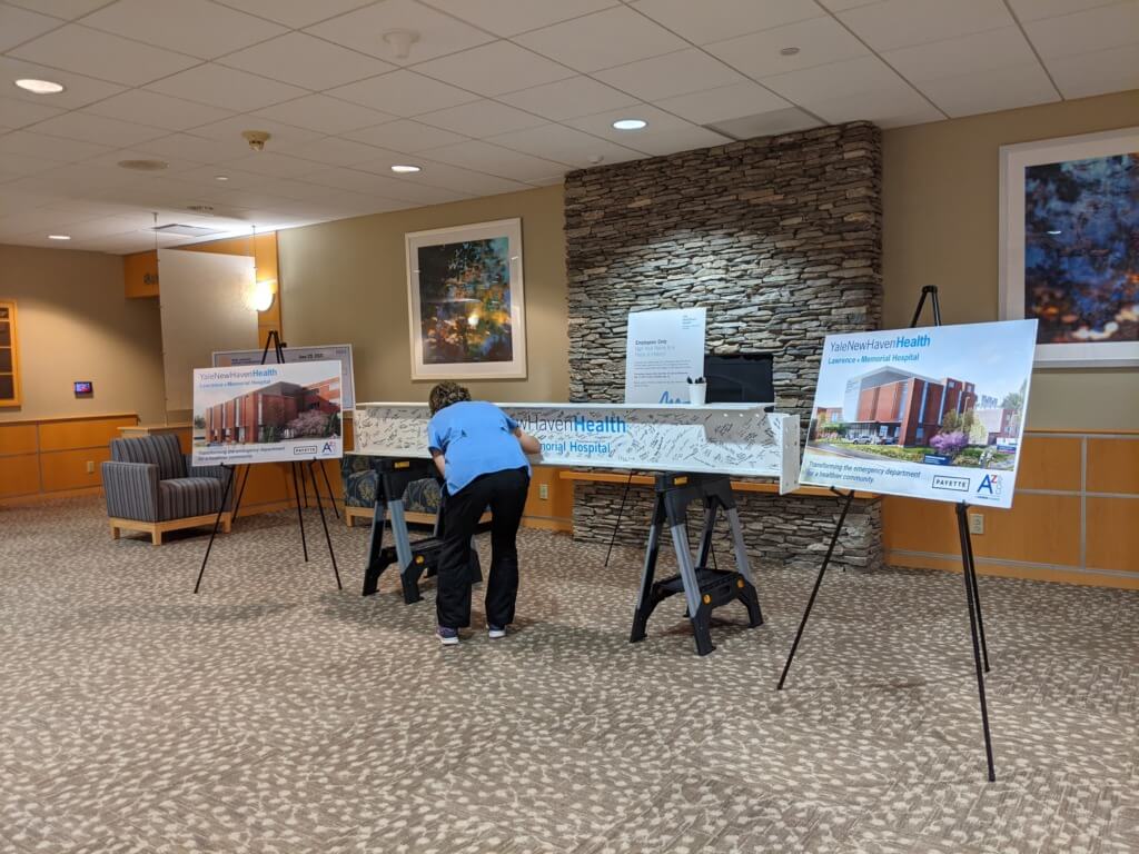 YNHH Lawrence + Memorial Hospital held a steel signing ceremony for the topping off several weeks ago and opened the beam signing to all of their staff to mark an exciting milestone for the hospital – the first new building addition on their New London campus in over twenty years!
