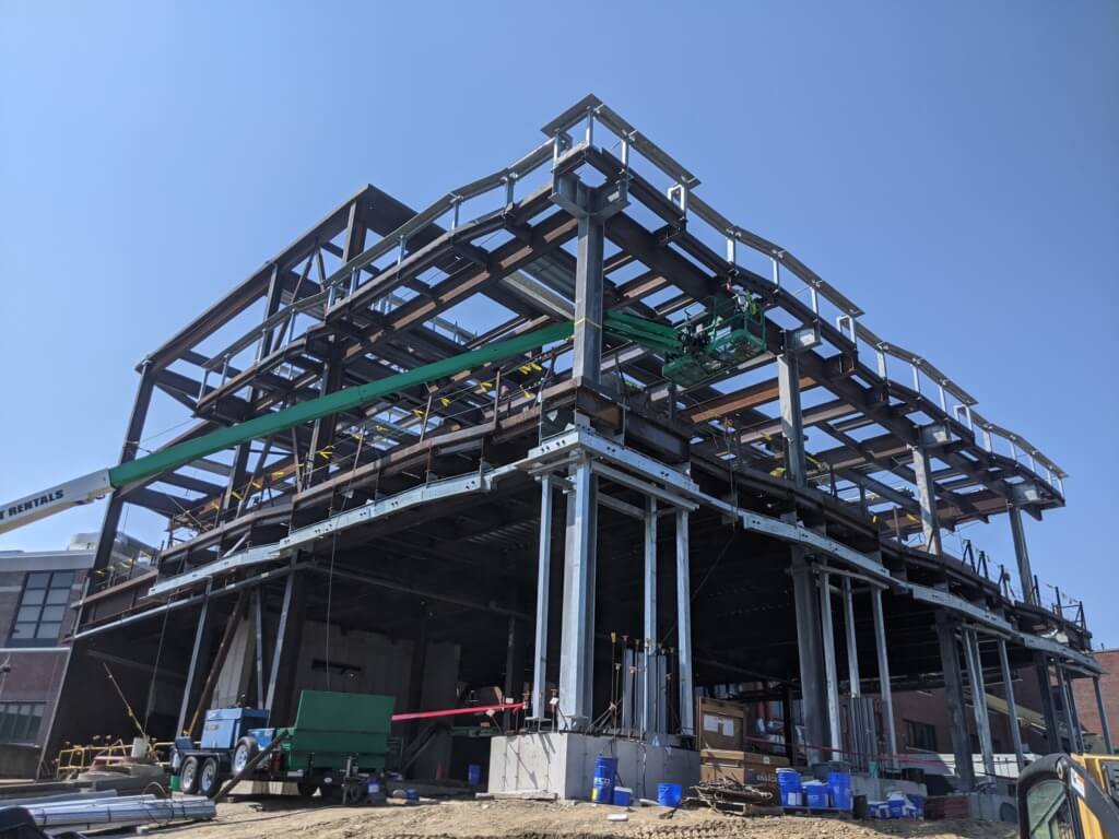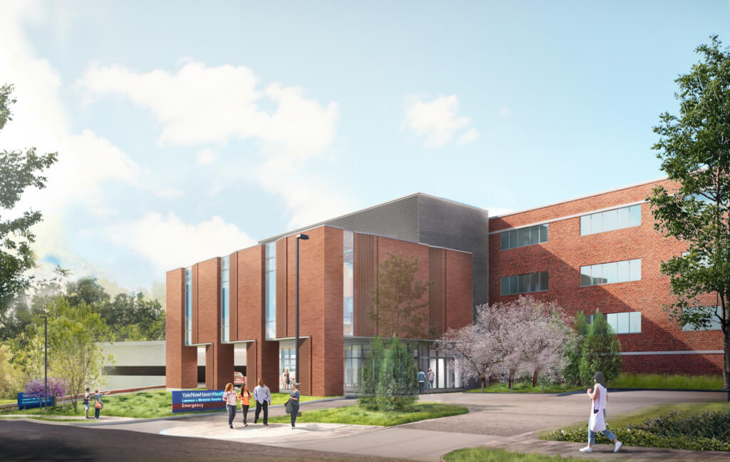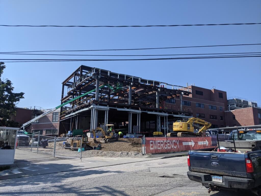 After more than 19 months of underground construction of infrastructure distribution and foundations to support the new normal and emergency power equipment for YNHH Lawrence + Memorial Hospital, the design team is ecstatic to share a construction update that reveals the massing of the Emergency Department addition building. The month of August saw a great deal of activity on site related to steel erection, with an excellent job by AZ and the steel crew navigating some tricky existing conditions.