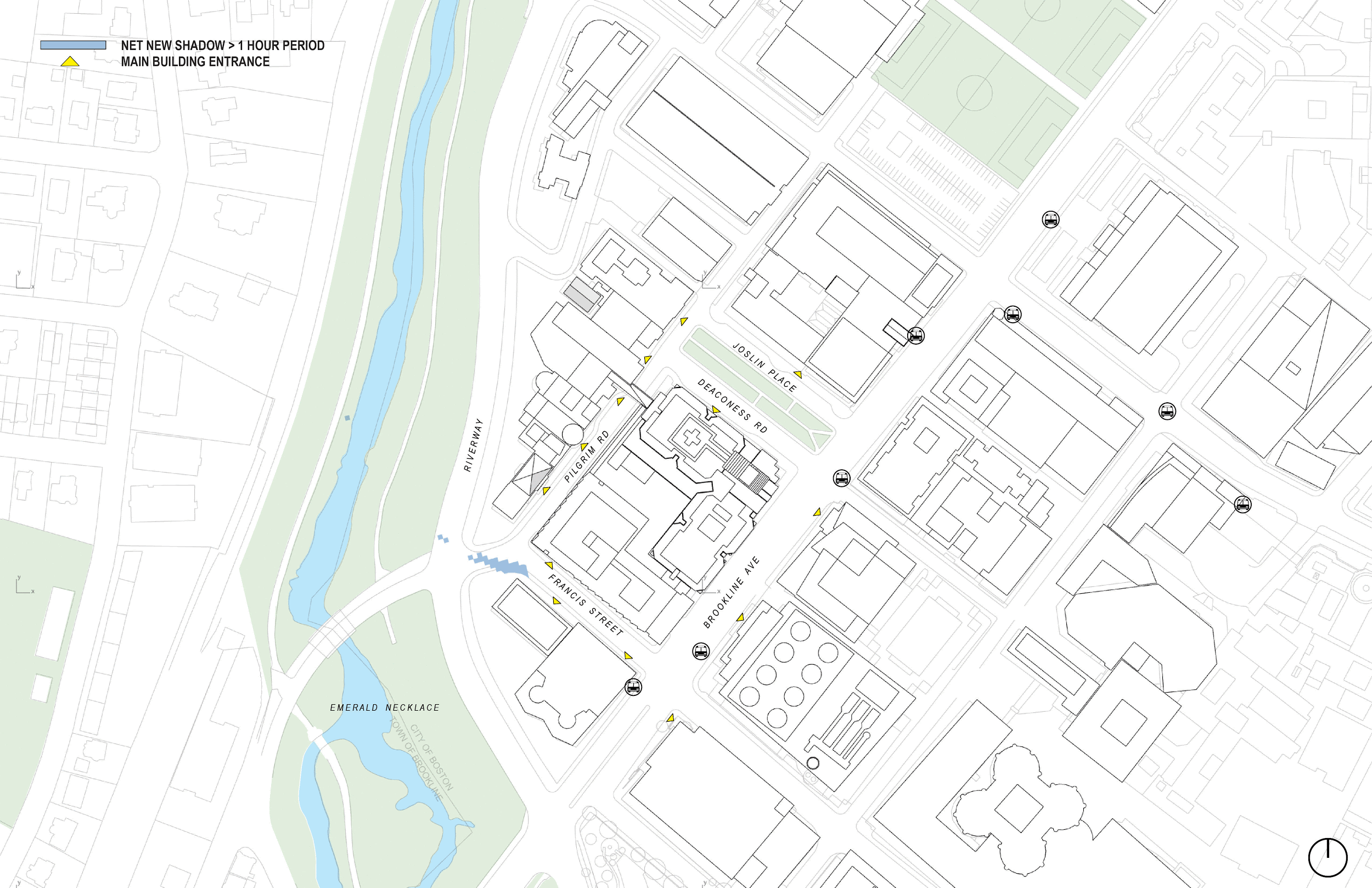 One of the LMA Interim Planning Guidelines’ purposes is to restrict new shadow impacts on the City of Boston parks with particular concern about projects that cast new shadows for more than one hour on the Vernal Equinox (March 21) on any location in the Emerald Necklace, Joslin Park or Evans Way Park (see Figure 1). Given this requirement, the documentation of net new shadows cast onto the Emerald Necklace by the NIB proved to be a unique exercise for the design team.