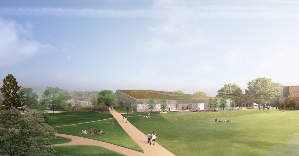 As was the case in the two previous examples, the New Academic Building has a simple massing – a four-sided polygonal footprint. Given the organic organization of the buildings sited along the Green, the new Academic Building chose to avoid any accidental alignment with its adjacent buildings, thus it features a non-orthogonal shape. The result is an unmistakable independent form, and object that is free from the rules that regulate the existing perimeter buildings. However, the building remains relatively quiet, subtle, and low, and it does not try to build a strong contrast with its context. Importantly, in a clear gesture to anchor itself to its place, its large roof is low, slightly sloped and planted, essentially suggesting a continuation of the topography of the Green.