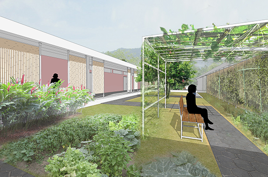 A change has been made to the roof design due to a new piece of information recently brought to the team’s attention. Back in 1985, a Category 5 hurricane ripped through Fond des Blancs and destroyed much of the area. By comparison, Hurricane Katrina was Category 3. It has been predicted that this region is due for another hurricane not too far into the future. The current design calls for a high pitched roof of steel joist and Tectum decking over the patient wards area. Concerns were raised as to whether this construction system will be able to withstand the impact of a Category 5 hurricane, especially with water penetration. For this reason, a decision was made as a precautionary measure to replace the pitched steel joist roof with a flat concrete ribbed roof. This alternative would provide a more effective encapsulation of the building envelop. Roof drainage pitch will be achieved by using Fino, a locally sourced building material. With this modification, clerestory windows and ventilation louvers will also be added to the north elevation to bring even greater natural light and cross ventilation through the space.