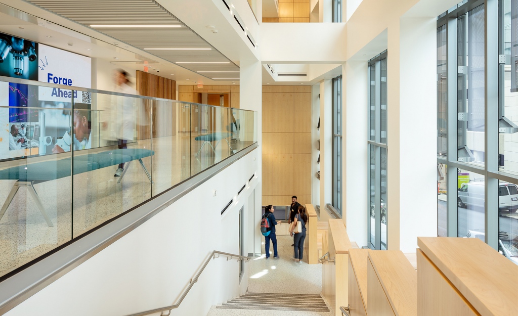 Key goals of the University were to provide ample natural light, more student space, large format classrooms, team-based learning classrooms that can accommodate 85 to 100 people and a combination of formal teaching and studying spaces alongside casual spaces for students.