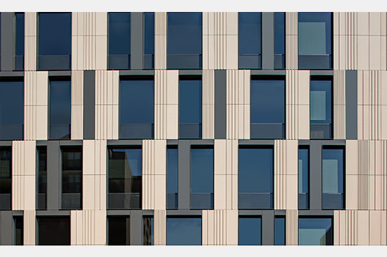 The terra cotta panels on these two façades feature an alternating pattern of narrow ribs that subtly project from their face. Depending upon sun position and other atmospheric conditions, variations in the shadow patterns created by these ribs can cause the building to progressively alter its appearance over the course of the day. Sometimes the ribs cast deep shadows; at other times, their edges create bright pin-stripes of light. Far from being gratuitous, these visual effects are important attributes of an urban campus building. While some people will only experience the building from a passing car, a great many more people will interact intimately with it every day. These unexpected variations enliven their daily experience.