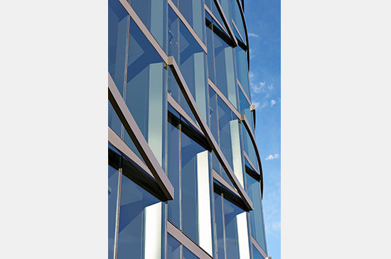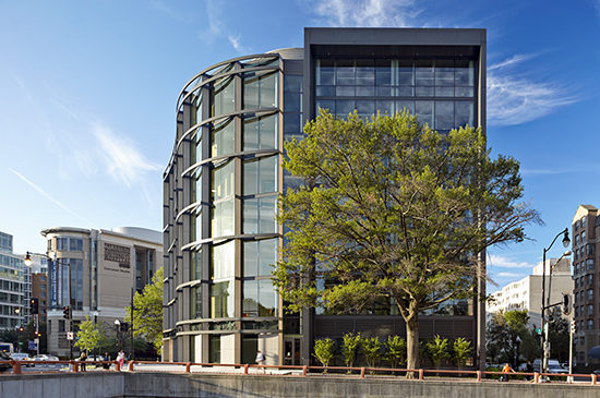 Here, recognizing that the underpass precludes any development along K Street north of the site, the building presents an unusual double-curved glass wall to the Circle. Half of its length follows the shallow expected concave arc, generated by the Circle’s radial form. The other half, however, is convex in shape; it bends outwards towards the K Street corridor. Moreover, the glass wall is not a conventional, continuous plane of glass, but rather an array of nine individual facets, stepped along the double curve in a saw-tooth pattern. The continuous metal bands which denote each floor level on the taut New Hampshire and 24th Street façades here suddenly become three-dimensional, taking the form of segmented arcs that carry the building’s kinetic energy around the Circle and west along K Street.