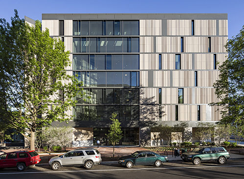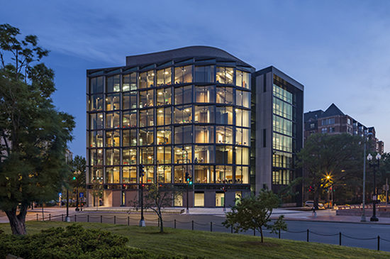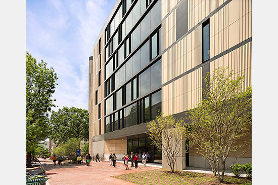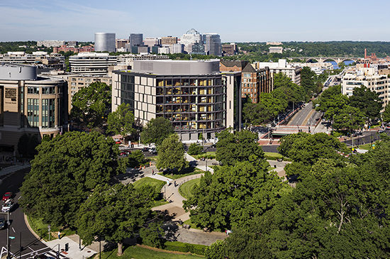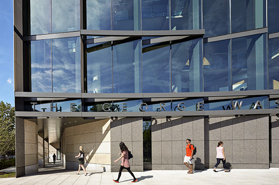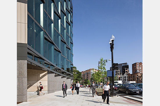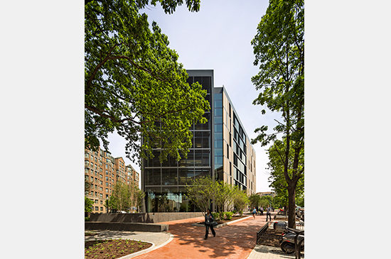 Most academic buildings offer few opportunities to enliven the street the same way that commercial buildings do — with retail space, cafes or restaurants. As a result, the Milken Institute School of Public Health at the George Washington University engages the public space surrounding it in other ways: through careful placement of key components of its space program; thoughtful massing and façade articulation; architectural craft and attention to detail; and the creative treatment of the building’s base.