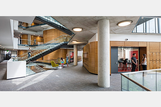 This last theatrical aspect of the design also has its roots in the belief that urban buildings have a special obligation to enliven the cities in which they sit. While the long sides of each projecting saw-tooth bay are glazed from floor-to-ceiling, providing unobstructed views of the student study spaces and bamboo-clad classrooms beyond, solid panels fill in the short return leg of each bay. What looks like an entirely transparent building when approached from the east, unexpectedly presents itself as a solid building when seen from the opposing path of travel.