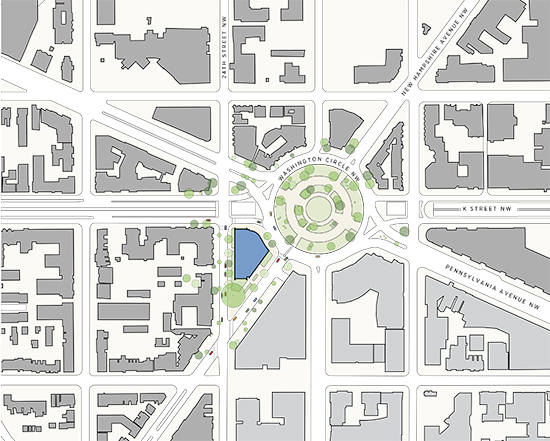 The site’s curvilinear third side faces directly onto Washington Circle and the leafy park at its center, forming one relatively narrow segment of the circle’s broad circumference. K Street defines the site’s shortest edge. It splits into two travel lanes at this location, a surface road and an underpass which diverts traffic under the Circle.