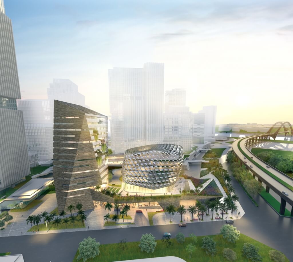 As the centerpiece of the science city on Hengqin Island, the client tasked us with creating an eye-catching building for their Innovation Center. In typical PAYETTE fashion, we took that request a step further by telling a story with the building about the elevated landscape park as it winds around the neighboring buildings and into ours, where it becomes a nest for a precious jewel to sit atop. The tower and landscape plinth have a mountainous language that is in conversation with the elevated greenway. We chose brick to further evoke the feeling of an old, rough mountain that has stood there for centuries.