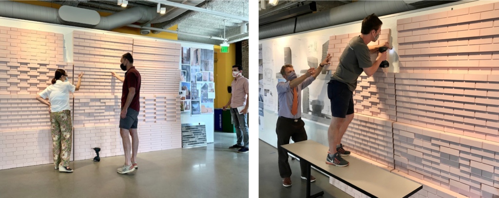Upon entering the room to view our mock-ups the team quickly decided that a standard brick in a standard running bond worked best. We realized that all the decorative patterns we studied were nice in a small sample – but would be an overzealous approach to an 85m tower. There is a lot that we can design, model and imagine in 3D, and although the tools we use don’t exactly replicate reality, they get us close and lead us to asking the right questions that ultimately guide us to a better design solution.