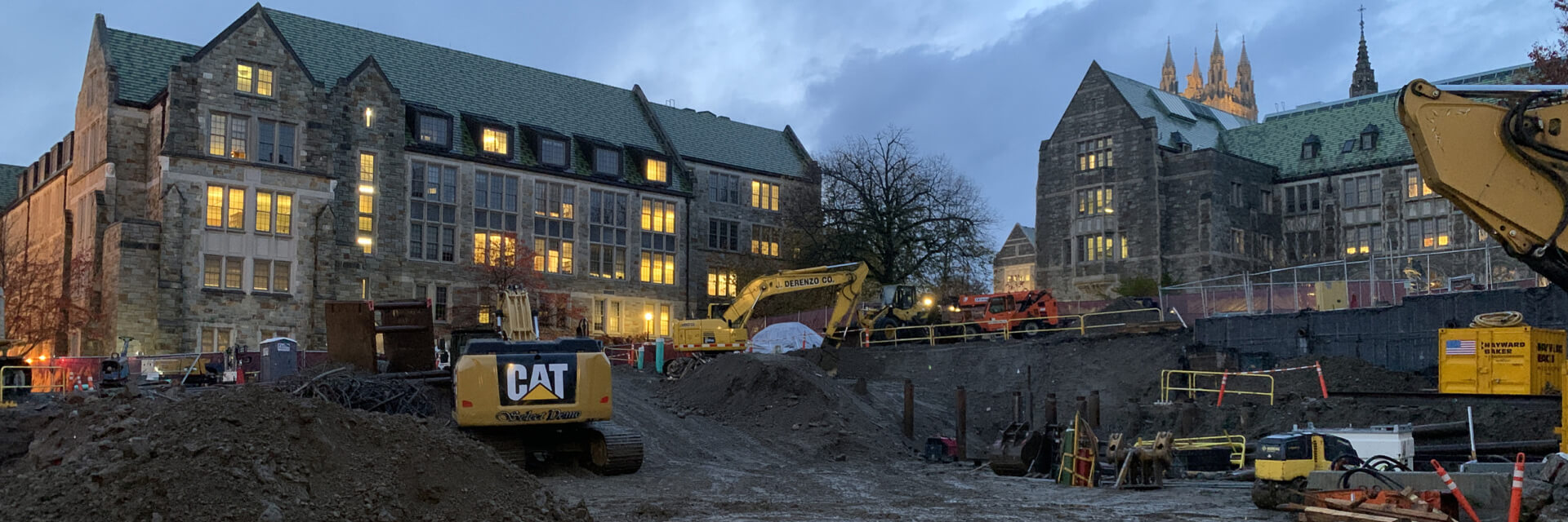 The Schiller Institute in its current state is a very, very large hole. Excavation is well underway and we bore witness to the perimeter micro piles and cross-lot bracing which define the extent of the support of excavation. At the northeast corner of the site, we discussed the excavation challenges that come with new construction so close to an existing building. The Schiller Institute is not only adjacent to, but will in fact connect with Higgins Hall via a connector bridge on the third level and a shared loading dock on the first level. To maintain the structural integrity of the foundation of Higgins Hall, the team used needle beams as opposed to a more typical underpinning methods due bedrock beneath the footing.