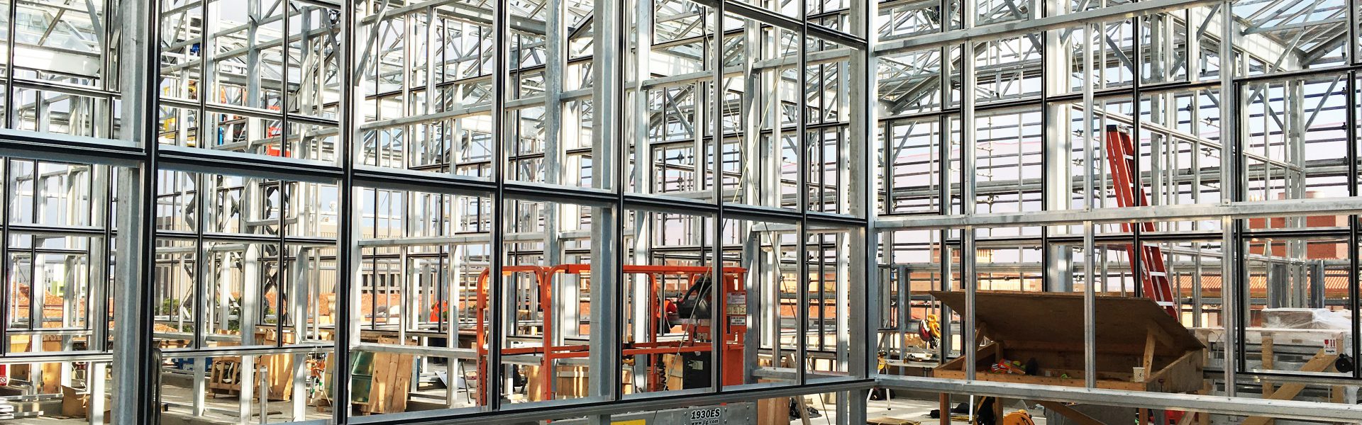Now that the platform is complete, the new building is finally taking on a vertical presence! In only a matter of weeks, the skeleton of both the Greenhouse and the Headhouse portion were erected. It’s exciting to see the changes each time I visit. The structure and framing stages are some of my favorite milestones in a project. Spaces take on shape quickly as their edges become more and more defined with each layer. You can be standing on the open slab one day, trying to imagine the feel and volume of the future space, and the next day the studs will be placed to either validate or redirect your preconceptions.