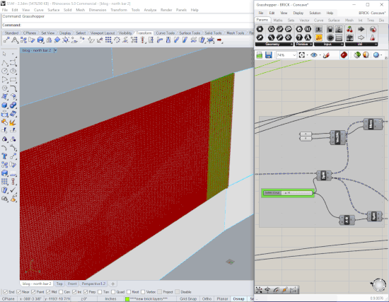Using Grasshopper as a tool for design was especially important for this exploration in order understand the effects of each scheme across the entire façade – each face of the east façade has at least 20,000 bricks! The iterative nature of the design process prompted me to use methods that would allow me to quickly isolate and manipulate a number of variables related to the brick construction. My early Grasshopper definitions acted as a springboard for future design iterations. As I developed new schemes, I was able to craft increasingly complex codes and carefully tweak the results.