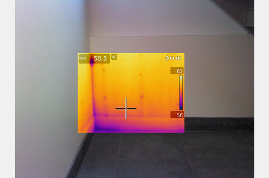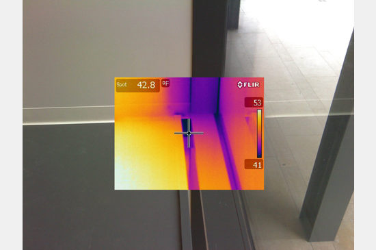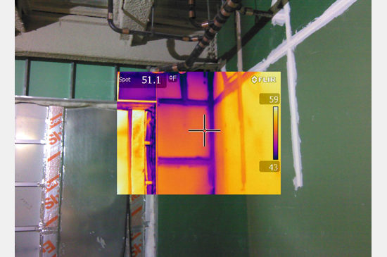 The first step with this grant was to travel to seven additional projects during the winter to take infrared images at targeted areas of the building envelope where thermal bridges had been previously observed to be most problematic. Winter is the best time to take thermal images in the Northeast, because the temperature differential is the greatest between the inside and outside during the season. The bigger temperature delta provides a more accurate image for the calculation of the wall’s R-value, and clearly illustrates the contrast of the thermal bridges in the images.