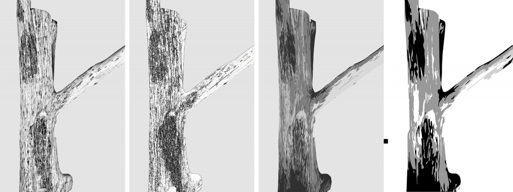 3. Define the values and experiment. The initial examples applied linework to depict the non-uniformity in the bark, but it contributed too much visual noise, establishing a form that was difficult to parse. The change to using solid blocks of color instead streamlined the visual.