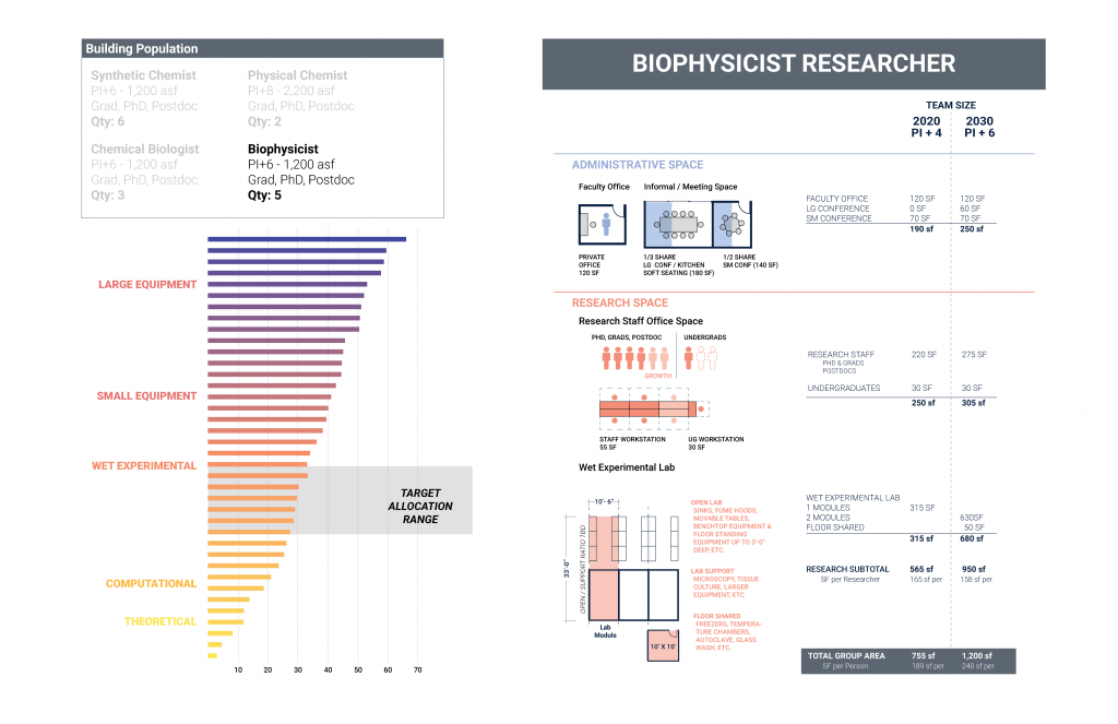 PAYETTE’s lab planning dashboard allows our planners to quickly develop estimates of research space needs based on a particular population. The dashboard outlines the total footprint of individual researchers, accounting for office, community and experimental space needs. Our lab planning process draws upon this library of lab typologies when estimating new space needs and building capacities, and it also allows us to compare space metrics across our projects.