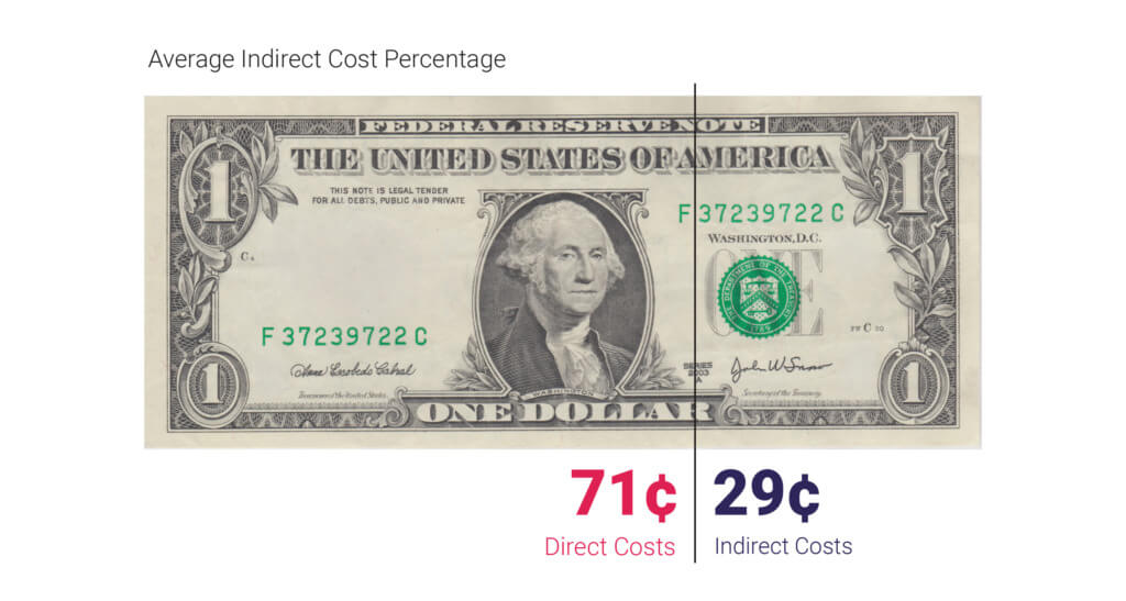 For this reason, NIH money is essential to universities, especially since non-profits and private funding sources don’t typically pay for indirect costs. In 2019, for example, every dollar of NIH funding included 29 cents for indirect costs and 71 cents for direct costs.