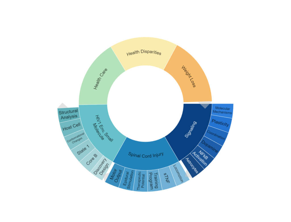 We also break-down NIH data to understand what diseases and types of health issues schools or departments are focused on. This enables us to suggest new ways to organize departments and researchers around their scientific collaborations in new buildings or across entire campuses.