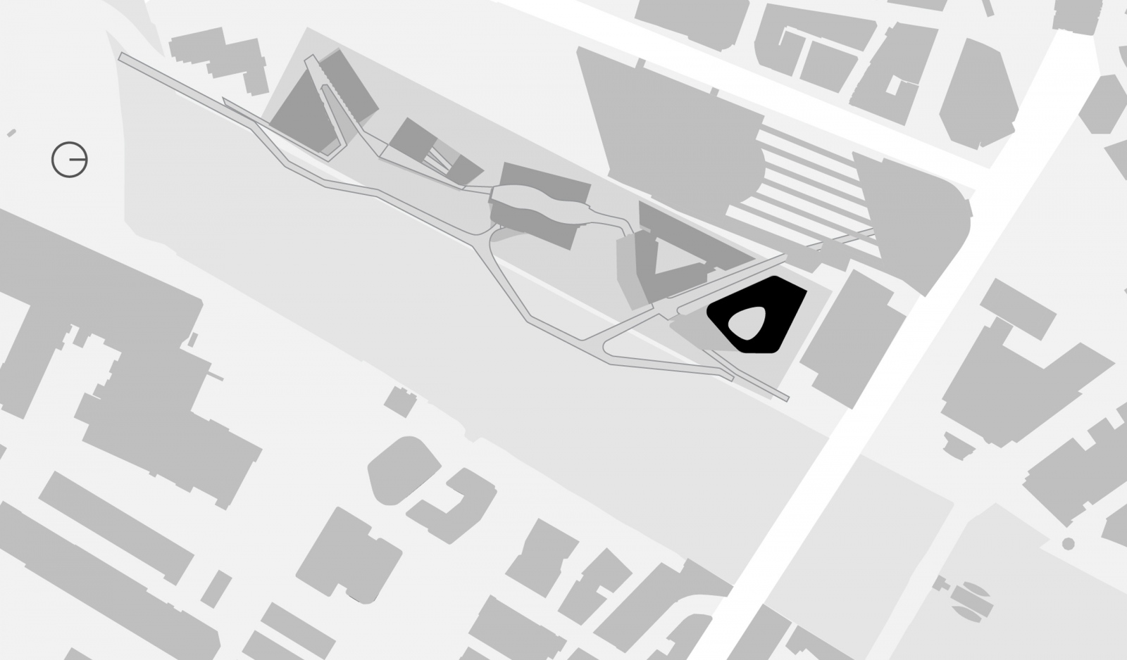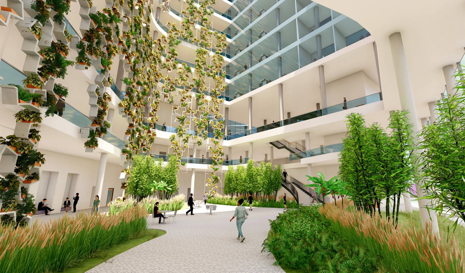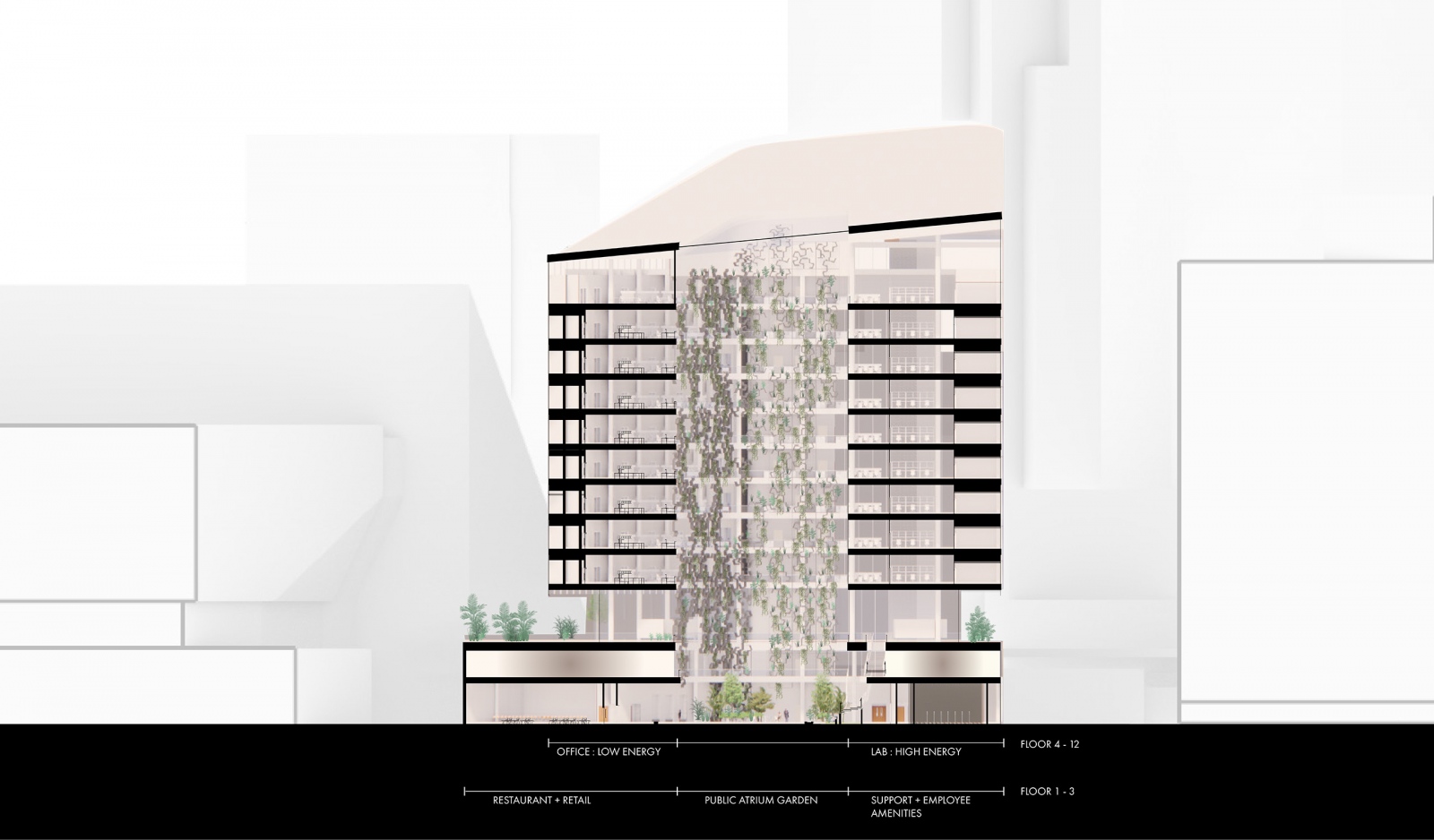 The Pharmaceutical Headquarters stands at the end of the five-building complex, serving as the entrance to the site. Serving community spirit, the private program of Pharma HQ is overlaid with public amenities and opportunities for social interaction. The proposed design values holistic health with wellness strategies incorporating biophilic design, daylight, healthy materials and restful spaces. The plan consists of three elements: a tight and efficient laboratory wing reserved for researchers; a less restricted area containing a restaurant, auditorium and meeting rooms open to the public; and a semi-enclosed atrium fully open to pedestrian explorers.