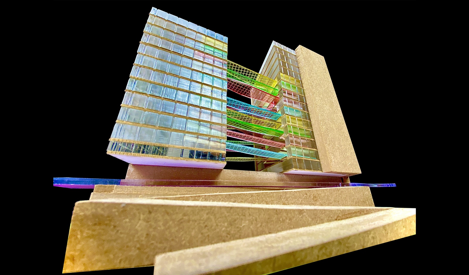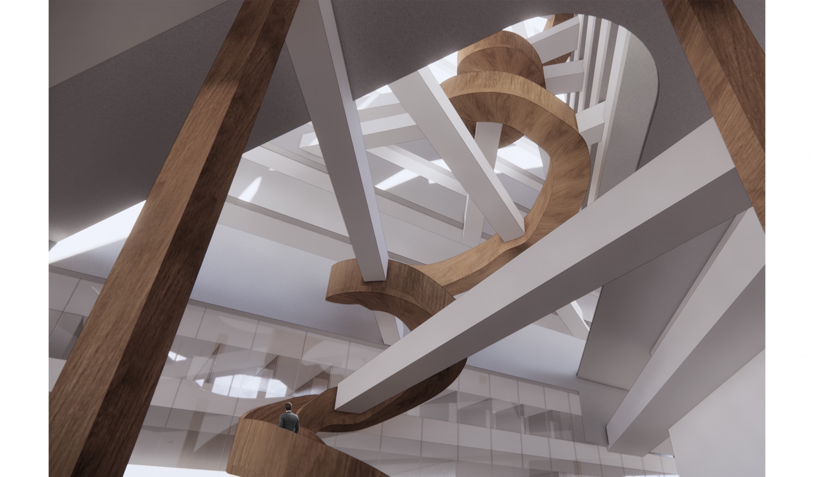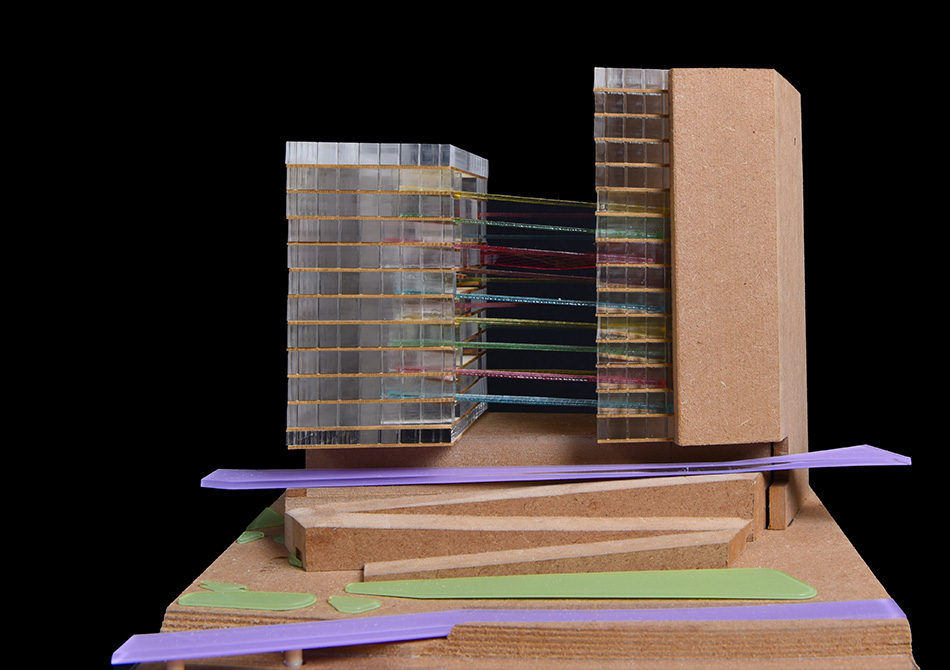The nature of Google Headquarters, as a programmatic concept and a mode of working, enables and encourages an expression of playfulness. Logic of structure, material, circulation, systems, fenestration and orientation are orchestrated to establish an ethos and identity for Google. A space of spontaneity, charged by occasions for creativity and imagination, establishes a fluidity and interconnectedness of day-to-day working. Floating colors comprising a series of bridges unite opposing programmatic areas as a ribbon, weaving its way up the two towers, reinforcing the culture of interconnectedness. Moments of rest and play populate the ribbon across the atrium, creating spaces rich with movement and life.