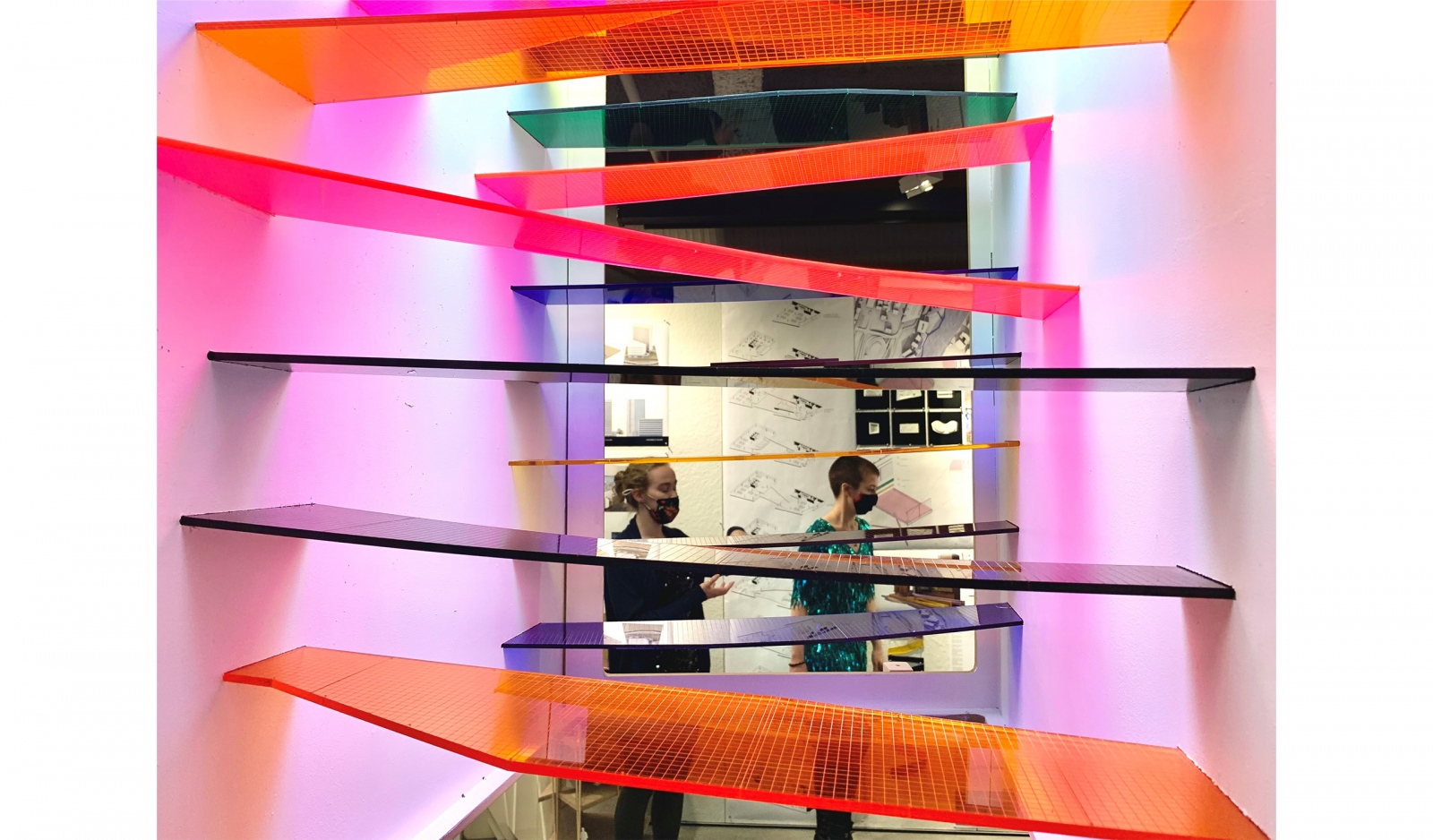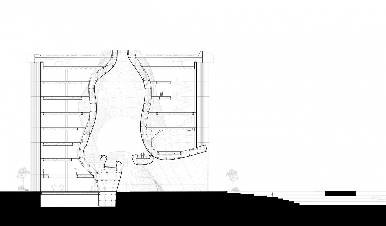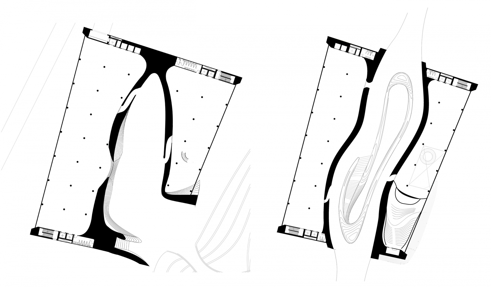 The nature of Google Headquarters, as a programmatic concept and a mode of working, enables and encourages an expression of playfulness. Logic of structure, material, circulation, systems, fenestration and orientation are orchestrated to establish an ethos and identity for Google. A space of spontaneity, charged by occasions for creativity and imagination, establishes a fluidity and interconnectedness of day-to-day working. Floating colors comprising a series of bridges unite opposing programmatic areas as a ribbon, weaving its way up the two towers, reinforcing the culture of interconnectedness. Moments of rest and play populate the ribbon across the atrium, creating spaces rich with movement and life.