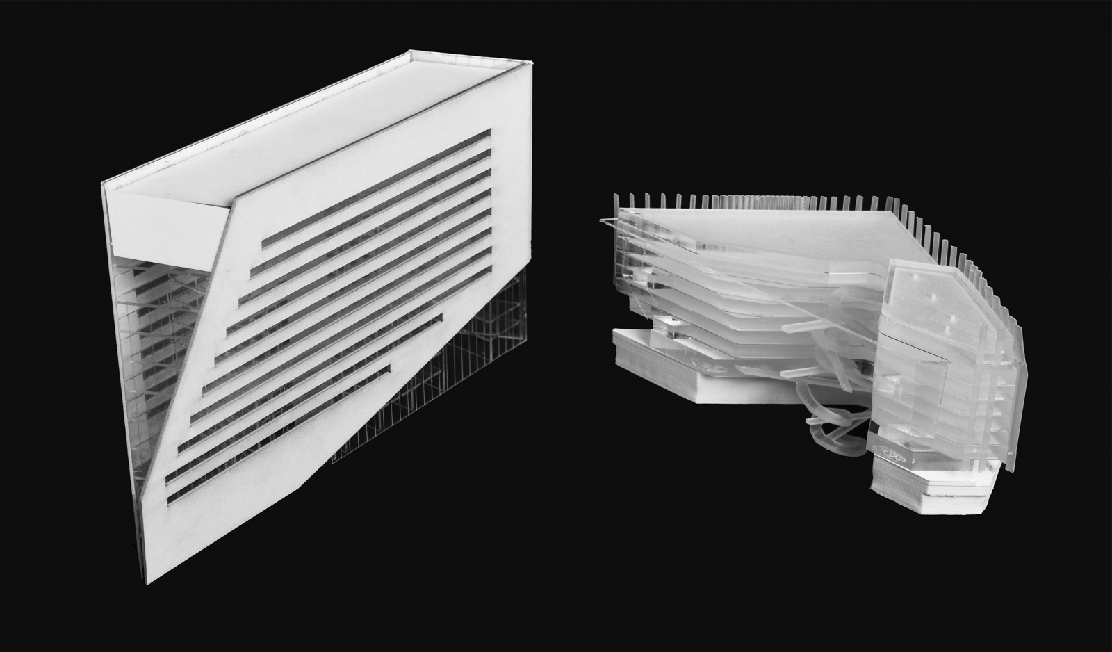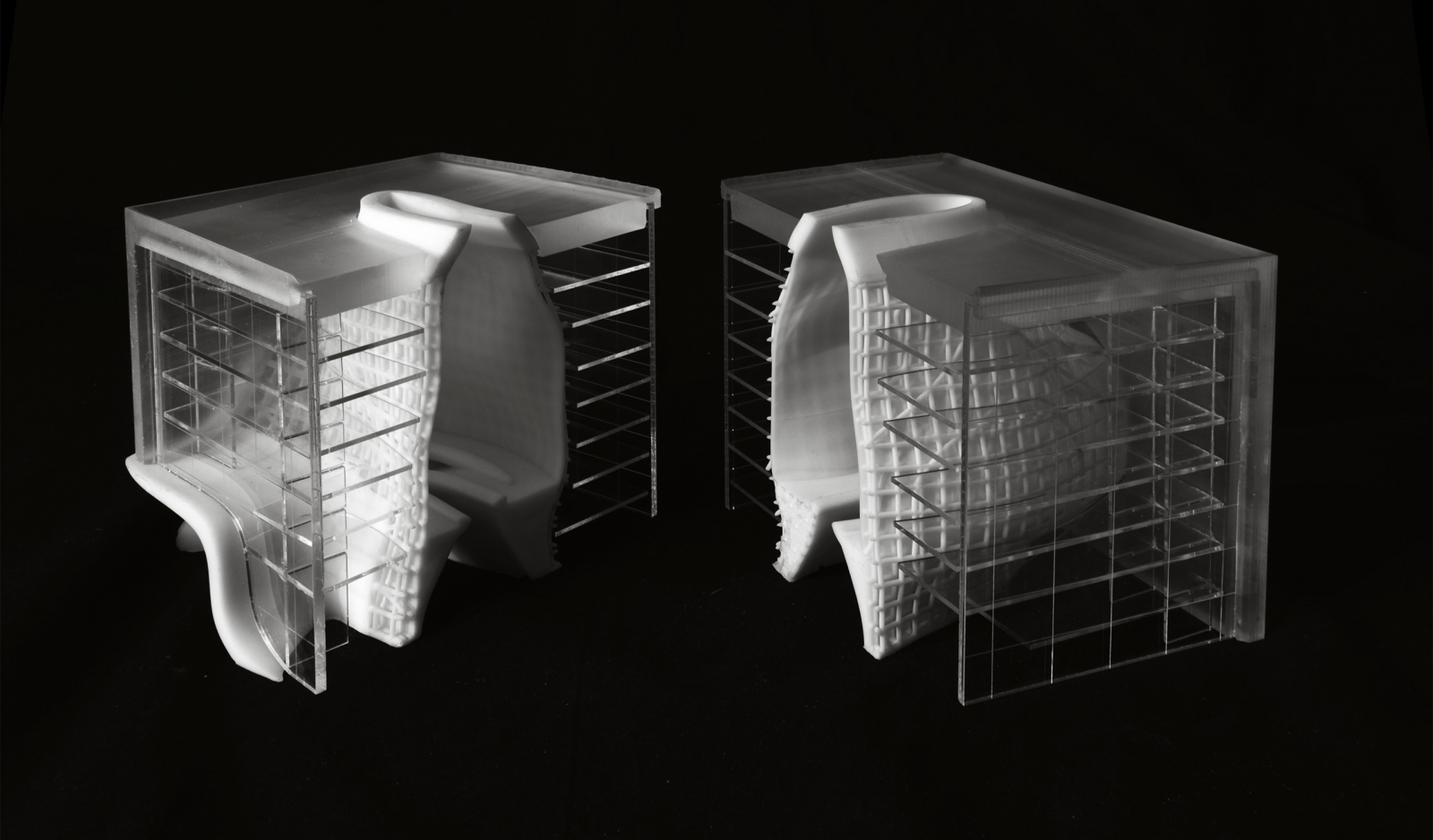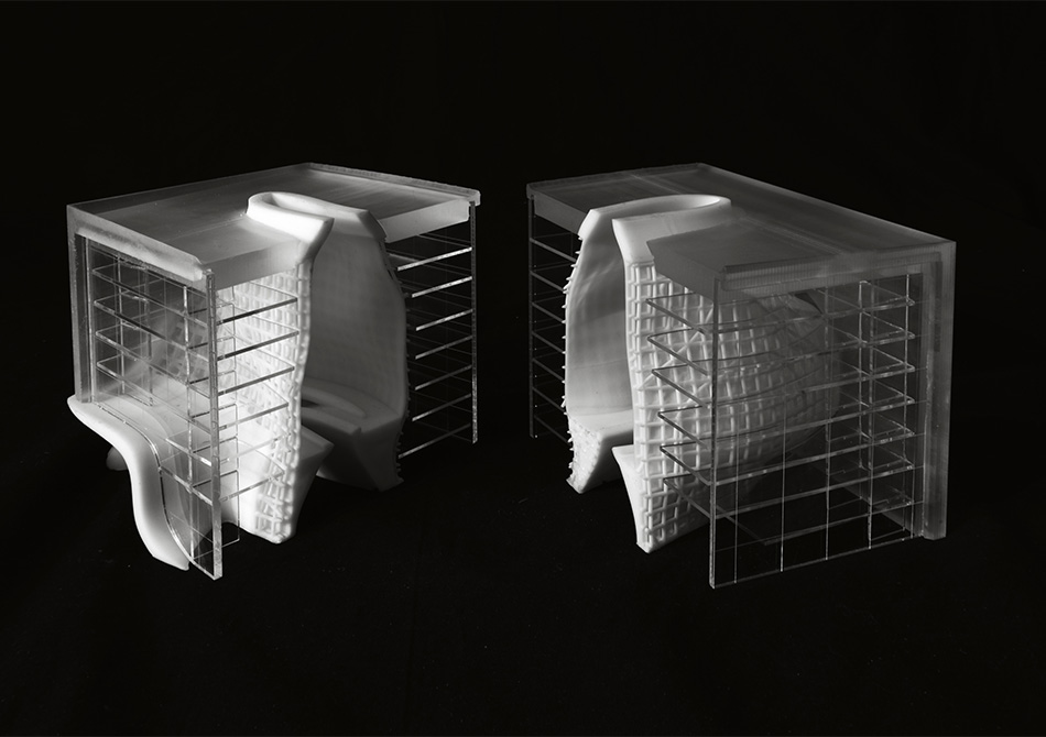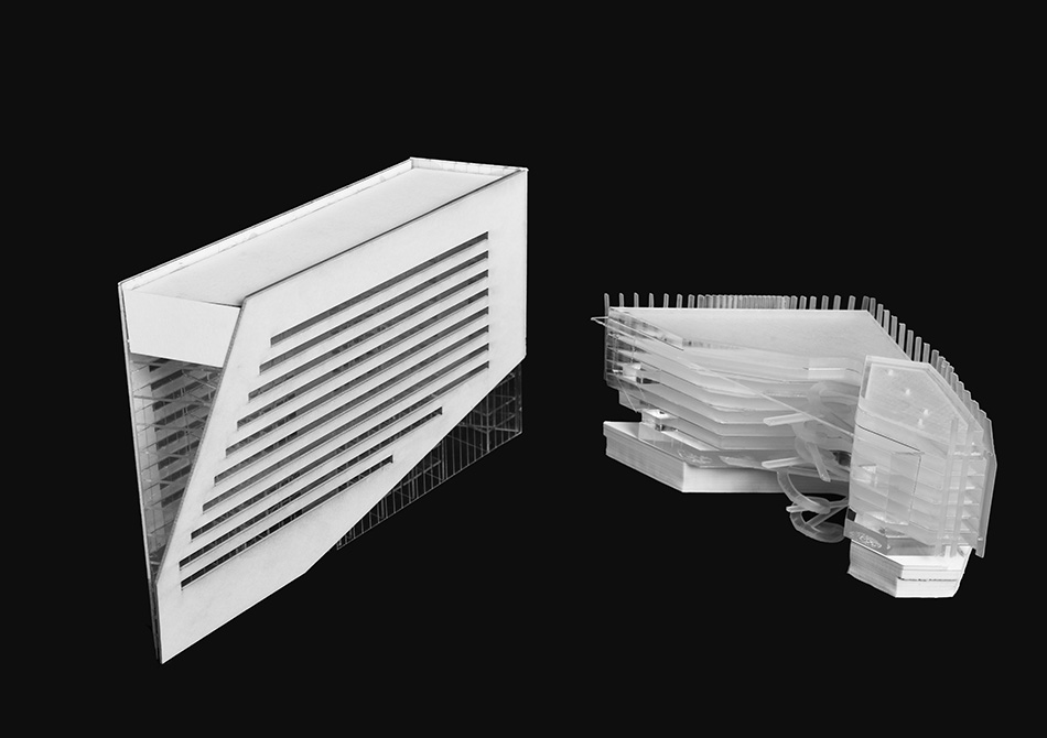 The program finds expression in two elements – the “Lamp” and the “Lab Bar.” A faceted lamp of light shines against a heavy mass. The grand spiral stair unites the rigors of scientific exploration and the necessity of social engagement as a monument to movement and a subtle reference to the geometry of the DNA molecule. The “Lamp” is a clear volume that houses programs of discourse such as conference rooms, offices and soft seating. The “Lab Bar” is a close-packed, efficient layout of high intensity lab spaces manifest in repetition and alternate rhythms.