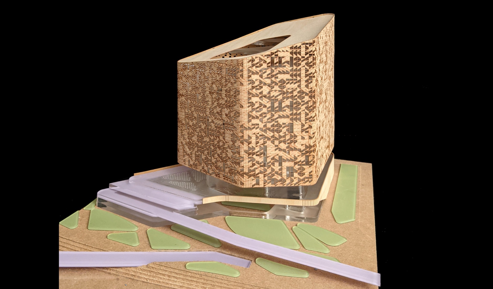 Occupying the center of the five-building complex, the Hive sits in quiet contrast to its four neighbors. The Hive was designed as a forum for public engagement – an intersection of growing research trajectories and the inevitable development of city expansion. Its simple exterior container reveals an explosion of space as one approaches via the overhead walkway. Serving as a communal hub for the complex, it is also a symbolic icon reinforcing the trajectory of technological innovation of the city.