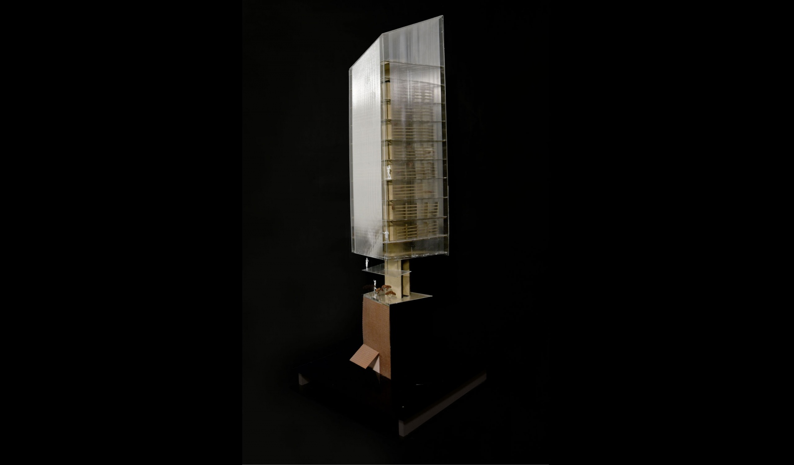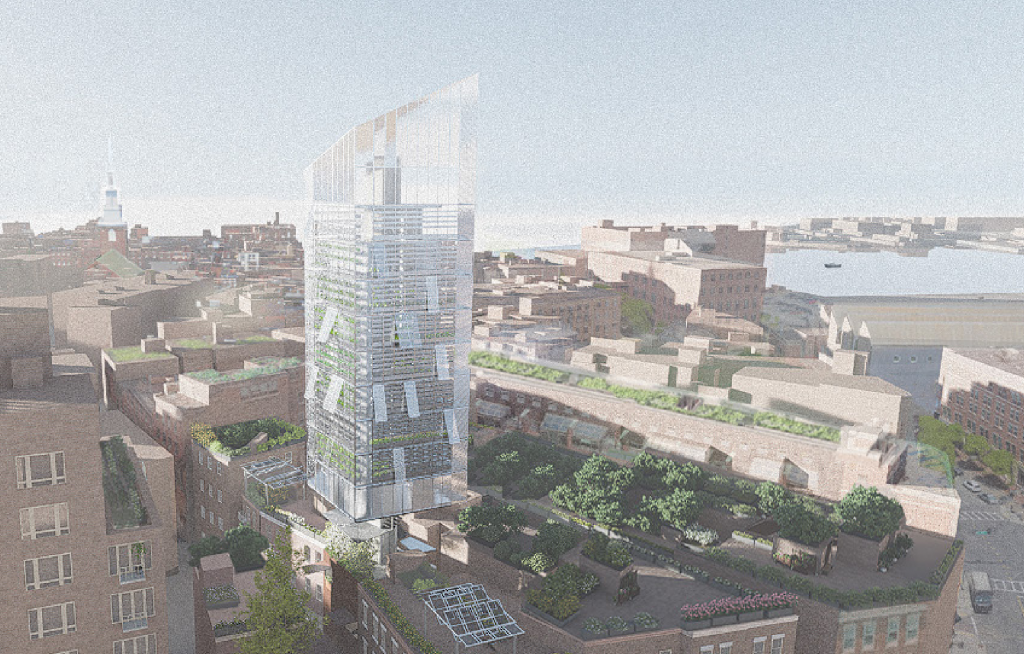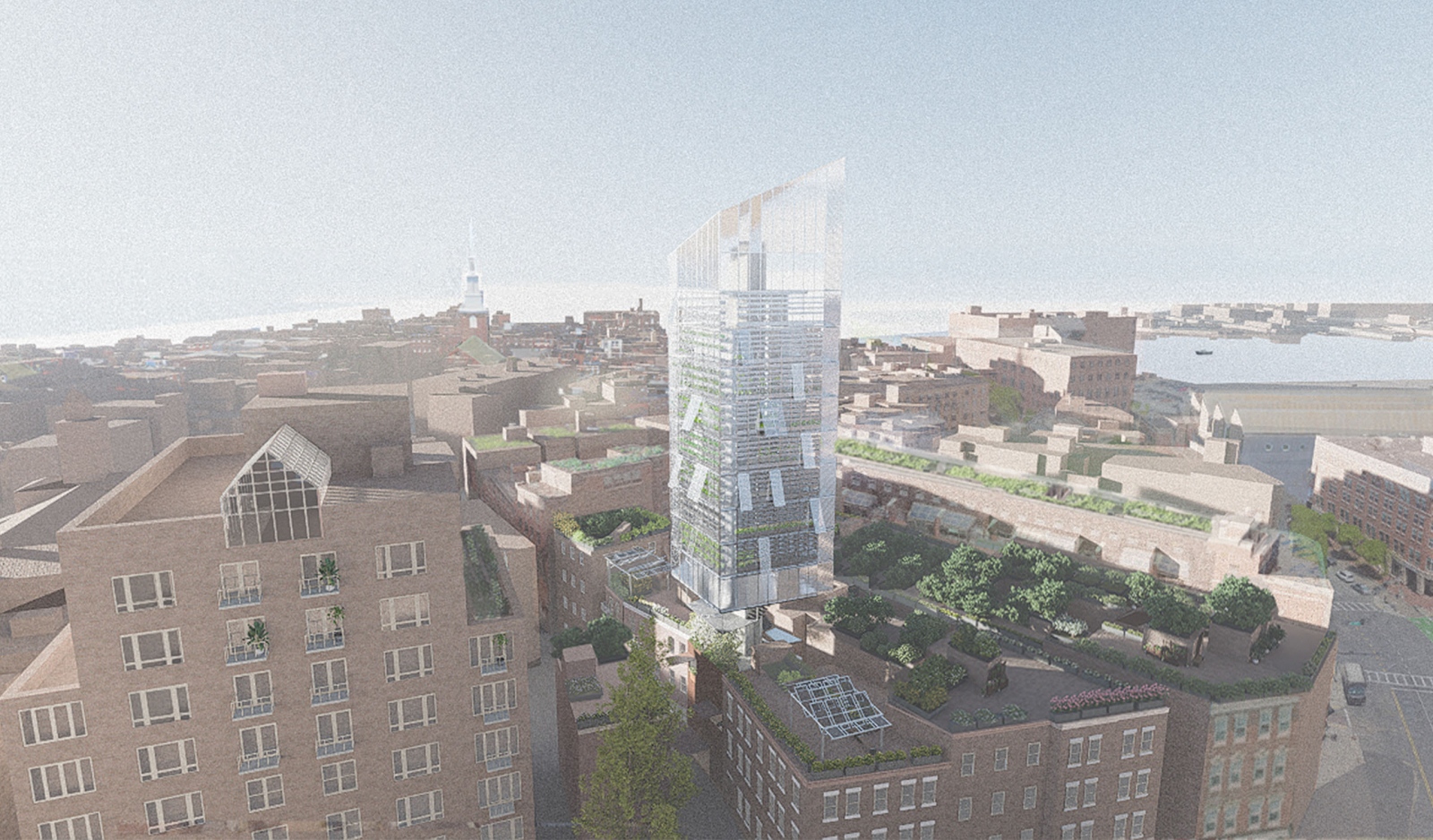 Sprout combines function and sustainability within the urban landscape of Boston’s North End. A coupling of a neighborhood market of its base and a vertical farm above, it operates as a self-sustaining machine for good of the community. A contrast of the vernacular to the neighborhood of brick, the greenhouse towers as a new, breathing landmark to the city.