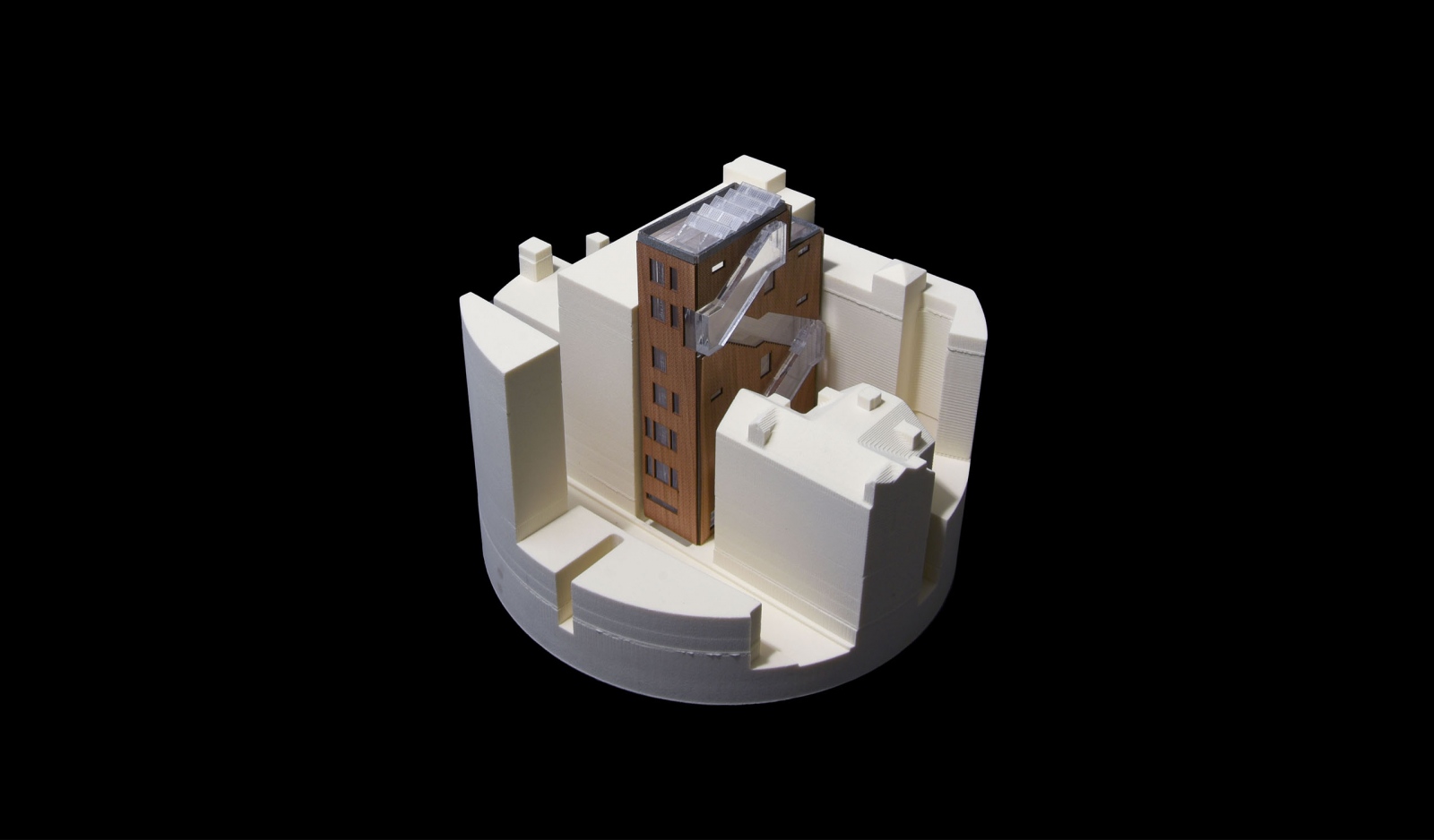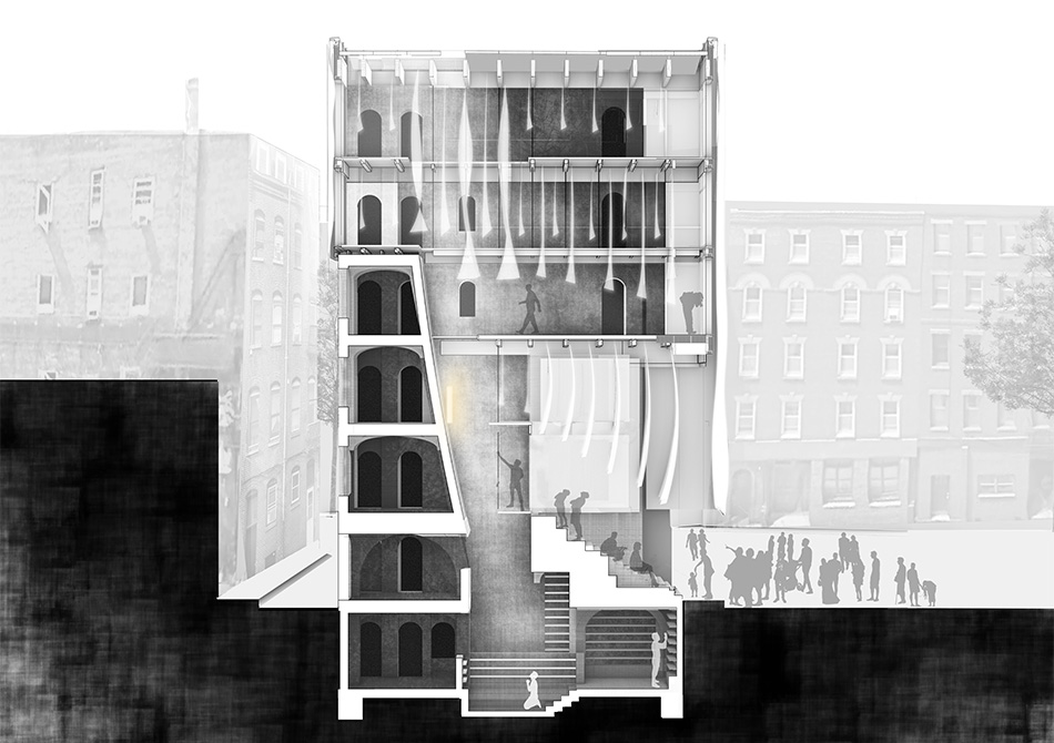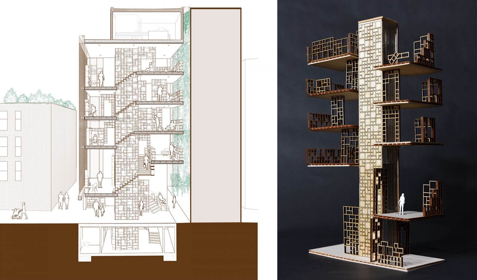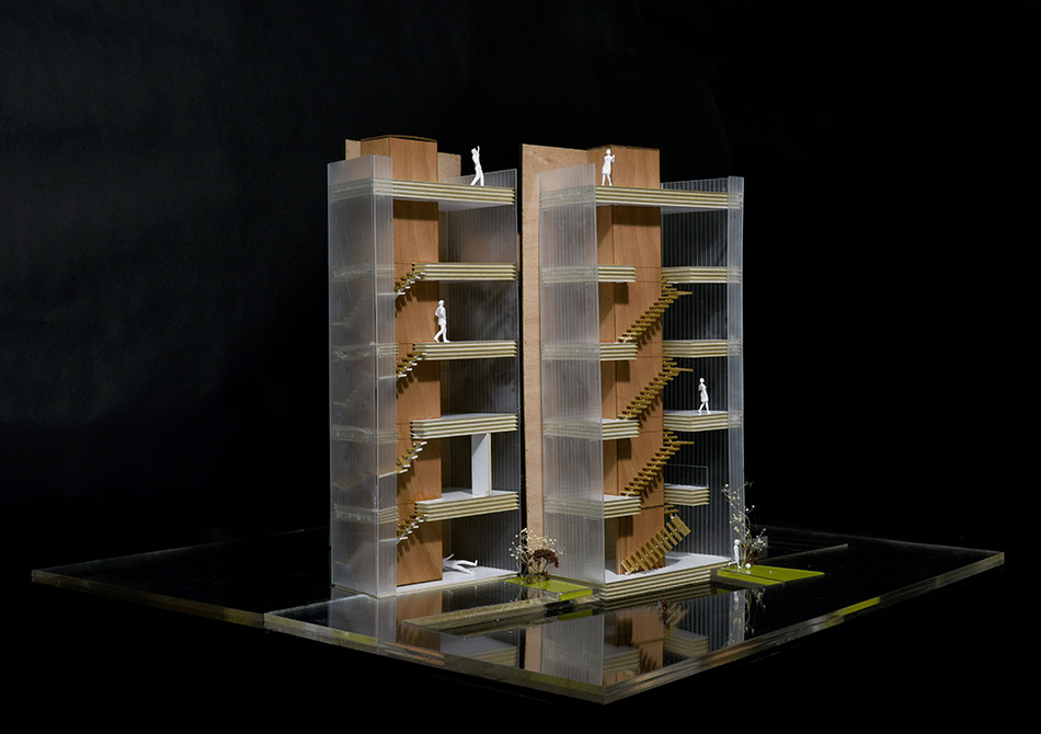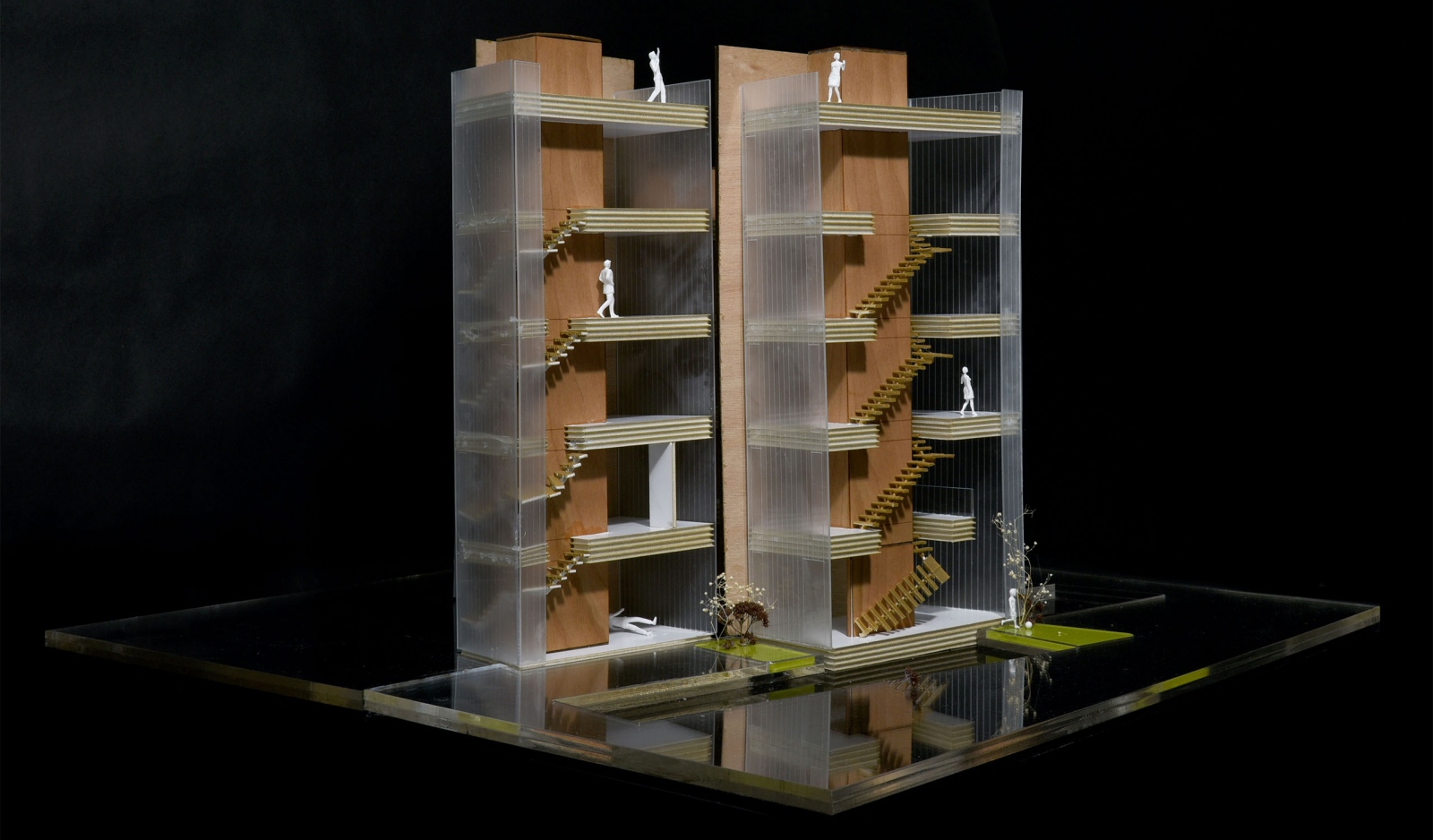 Because of the unusual nature of the seven sites chosen for the studio, the idea of a Sliver Building, which is extremely long and thin and much taller than it is wide, becomes a fascinating typology to explore. Sliver Buildings challenge conventions of existing prototypes due to the pecular conditions of each site and their funky proportions. Every element – a stair, door, hallway, or a window – holds an elevated level of importance and challenges typical architectural conventions of proportion and composition to gain access to natural light. The section becomes the key driver in organizing the space in between the front and back walls, with sidewalls that are often opaque. These are often buildings without corridors, but rather nested geometries of stairs and a series of contingent spaces that spill both horizontally and vertically through the void in the urban form to harness natural light.